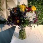 folhagem - 3 un. vaso de vidro - 1 un. flores variadas coloridas - 8 un. complementos variados aster e tango - 2 un.