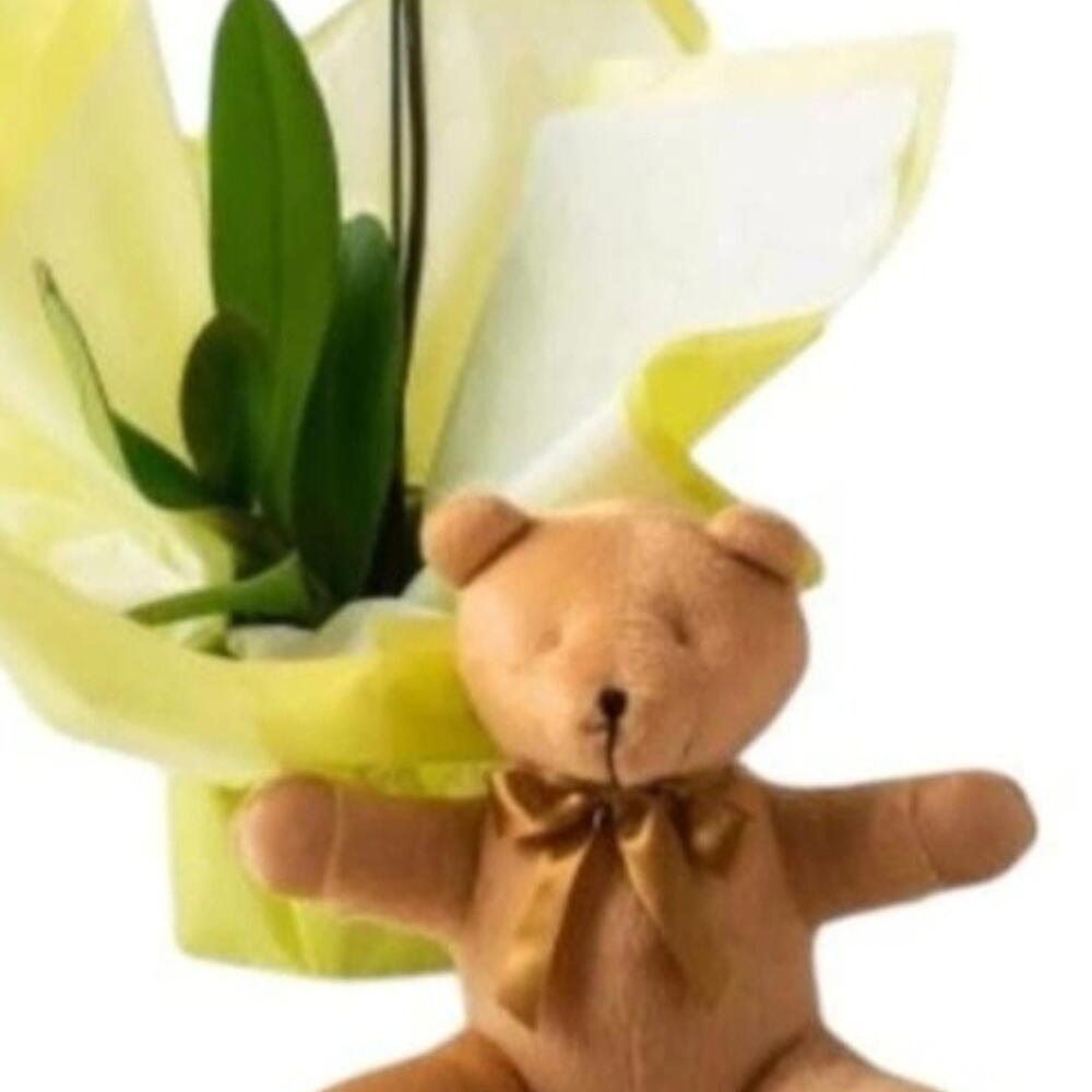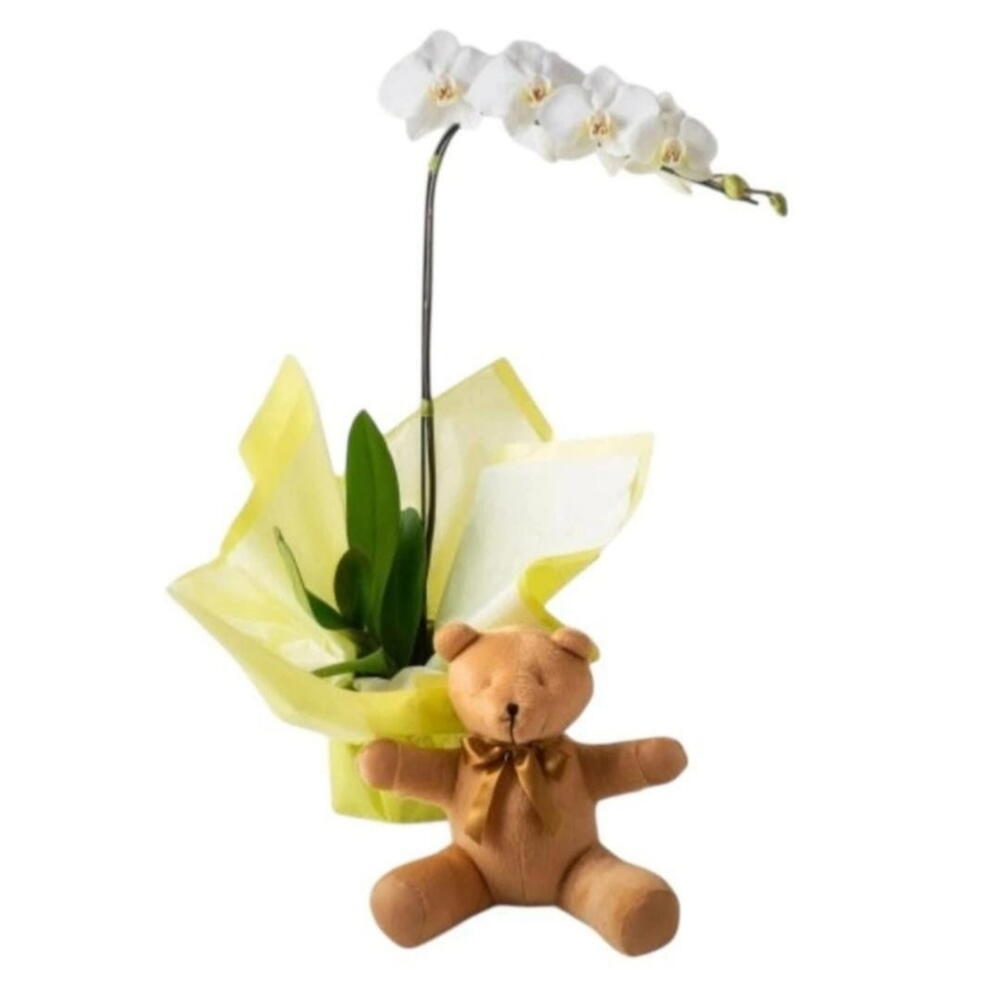 Orquídea Phalaenopsis Branca com Ursinho de Pelúcia. Para agradar a pessoa que você ama e admira.