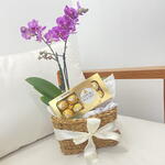 Orquídea p com caixa de bombons ferrero rocher 8 unidades 100g na cesta de palha reforçada com laço de cetim, ela vai embalada pronta para presentear uma pessoal muito especial para você.