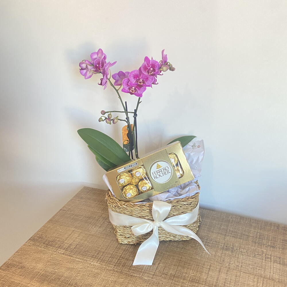 Orquídea p com caixa de bombons ferrero rocher 8 unidades 100g na cesta de palha reforçada com laço de cetim, ela vai embalada pronta para presentear uma pessoal muito especial para você.