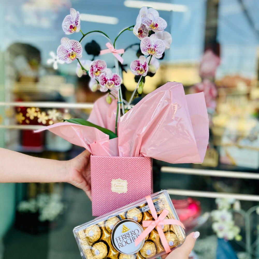 Surpreenda alguém especial com nossa linda orquídea em formato de coração! Acompanha uma caixa personalizada com 12 irresistíveis unidades de Ferrero Rocher, perfeita para celebrar o amor. Um presente que vai tocar o coração!