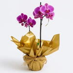 Orquídea Phalaenopsis lilás vibrante com duas hastes floridas, envolta em um papel dourado sofisticado e finalizada com um laço de palha natural. A combinação da cor intensa das flores com o dourado do embrulho transmite alegria, elegância e destaque, sendo ideal para comemorações, presentes marcantes ou para decorar ambientes com um toque de luxo e cor.