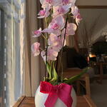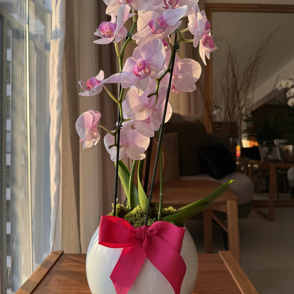 Orquídea rosa em vaso cerâmica e decorado com um lindo laço.