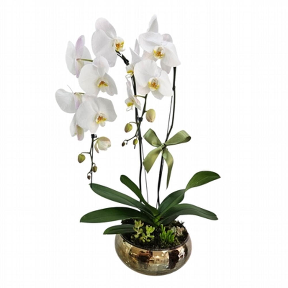 Um combo de orquídea phaleanopsis de alta qualidade e cuidadosamente selecionada, decorada em um vaso de vidro mexirica com suculentas em sua volta.
