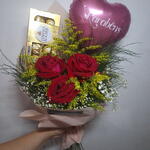 O presente perfeito para fazer o dia de alguém especial! Este buquê inclui um balão de coração metalizado que irá certamente trazer um sorriso ao rosto do destinatário. Acompanha uma caixa com 8 unidades do delicioso Ferrero Rocher, ideal para satisfazer os desejos de chocolate. O buquê é completado com as folhagens frescas do dia e uma poli tom claro, disponível no momento. Todo este conjunto é feito com a maior atenção aos detalhes, para garantir que a pessoa que o receba se sinta verdadeiramente amada. Ideal para todas as ocasiões!