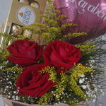 rosa vermelha - 3 un. ferrero rocher caixa 8un - 1 un. folhagens (disponibilidade do dia) - 1 un. poli tom claro (disponível no momento) - 1 un. balão de coração metalizado podendo ser rosa - 1 un.