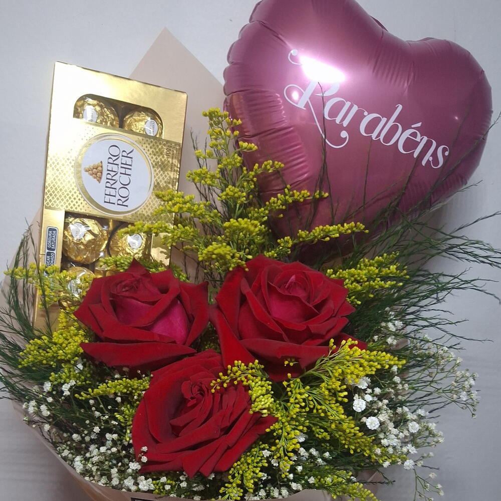 rosa vermelha - 3 un. ferrero rocher caixa 8un - 1 un. folhagens (disponibilidade do dia) - 1 un. poli tom claro (disponível no momento) - 1 un. balão de coração metalizado podendo ser rosa - 1 un.