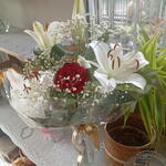 rosa vermelha - 1 un. gypsophila branca - 1 un. haste de lírio perfumado - 1 un. embalagem clear com fitilho dourado fosco - 1 un.