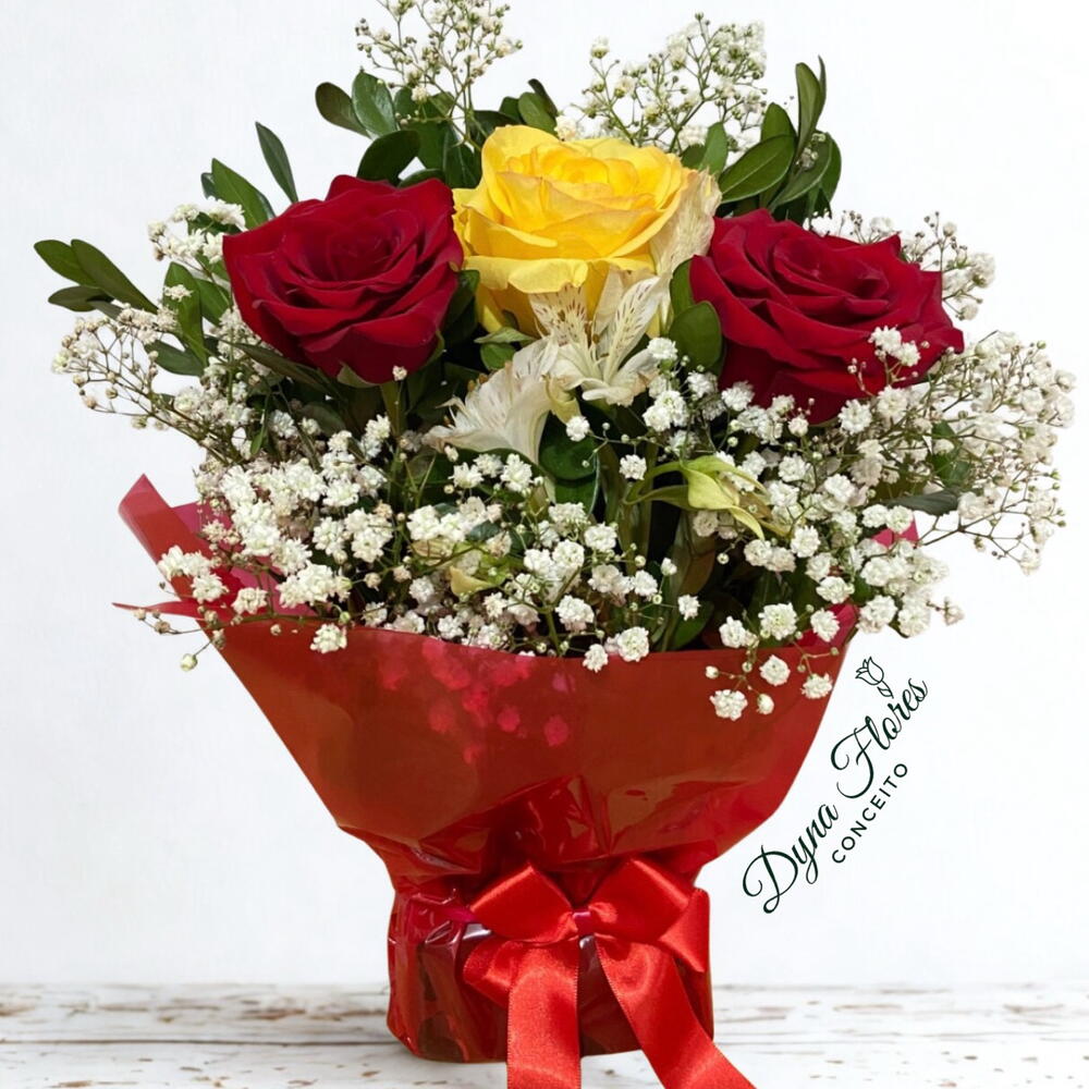 embalagem - 1 un. laço - 1 un. rosa naturais - 3 un. folhagens e complementos - 1 un.