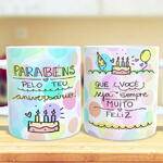 embalagem personalizada - 1 un. laço em cetim - 1 un. 6 bombons ferrero rocher - 1 un. caneca aniversário - que você seja sempre muito feliz - 1 un.