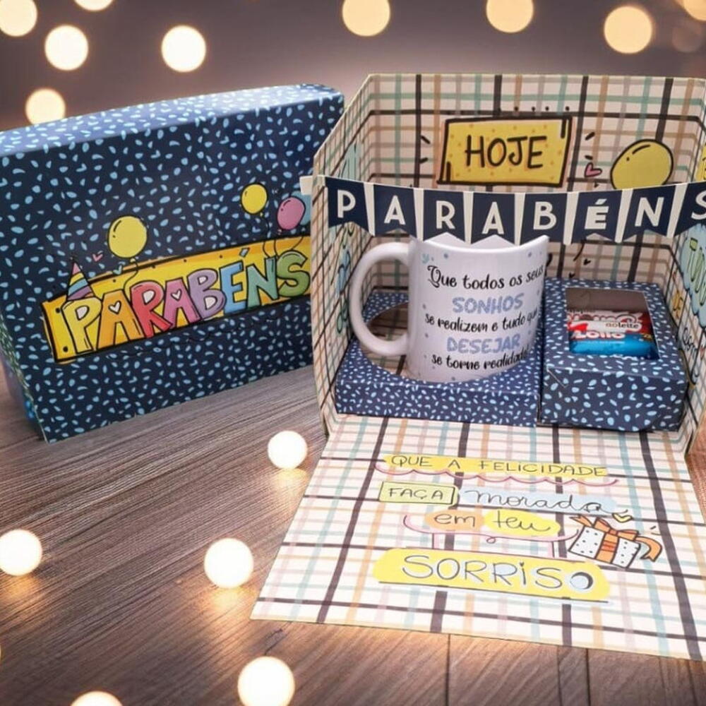 Celebre o aniversário da pessoa amada com uma surpresa encantadora! Nossa Caixa Surpresa de Aniversário foi cuidadosamente personalizada para garantir um momento especial e memorável. O que está incluído: Caneca Personalizada: Uma caneca única e exclusiva de aniversário. Feita com materiais de alta qualidade, é perfeita para lembrar desse Dia especial a cada café da manhã ou pausa para um chá. Chocolates: São 5 bombons sortidos ( Lacta ou Nestlé ) Por que escolher nossa Caixa Surpresa de Aniversário: Exclusividade: Cada item é cuidadosamente selecionado e personalizado para tornar o presente único e memorável. A caixa é decorada com um design festivo e elegante, tornando-a pronta para presentear, e além disso foi personalizada com mensagens especiais para essa data.