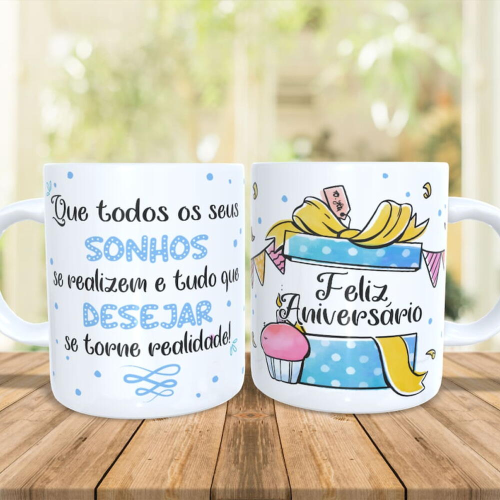 embalagem personalizada - 1 un. caneca feliz aniversário - 1 un. caixa com 5 chocolates - 1 un.