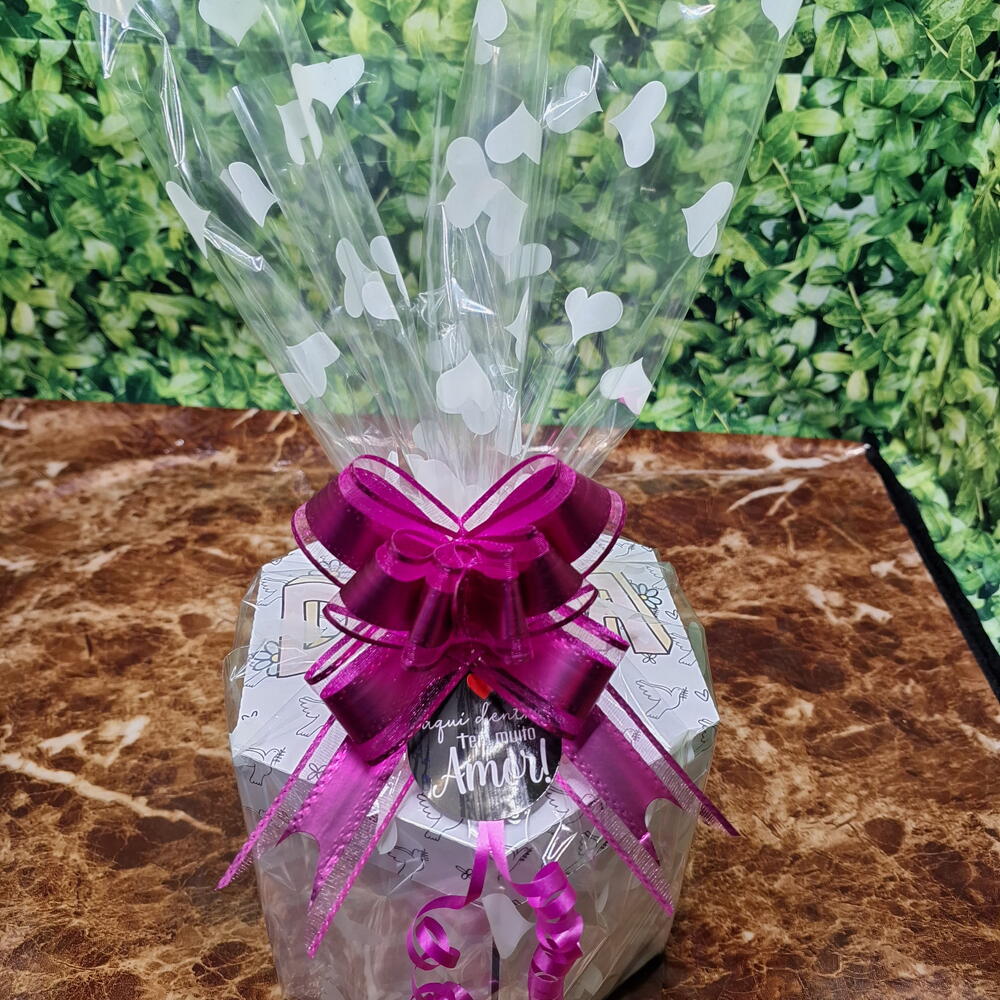 embalagem personalizada - 1 un. laço - 1 un. embalagem celofane - 1 un. bis 45g - 1 un. disqueti - 1 un. bombons sortidos (nestlé e lacta) - 4 un. caneca da dinda 325ml - 1 un.