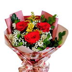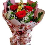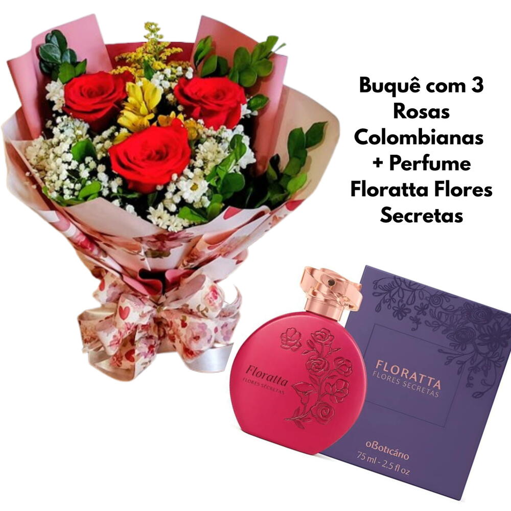 Buquê com 3 rosas colombianas vermelhas, delicadamente montado com flores complementares e acabamento romântico, acompanhado do perfume Floratta Flores Secretas. A combinação perfeita entre beleza, perfume e emoção para surpreender quem você ama.