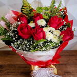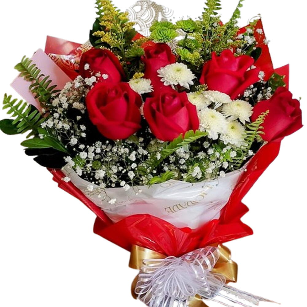 Buquê elegante com rosas vermelhas, perfeito para presentes românticos e momentos inesquecíveis. Composto por rosas vermelhas premium, flores brancas delicadas, mosquitinho e folhagens naturais que trazem volume e movimento. Embalado em papel sofisticado vermelho e branco, com laço dourado e detalhes que deixam o acabamento ainda mais luxuoso. Um presente que impressiona no visual, transmite carinho e marca presença em qualquer ocasião, seja aniversário, pedido de desculpas, surpresa romântica ou para demonstrar afeto sem data marcada. Ideal para surpreender com elegância.