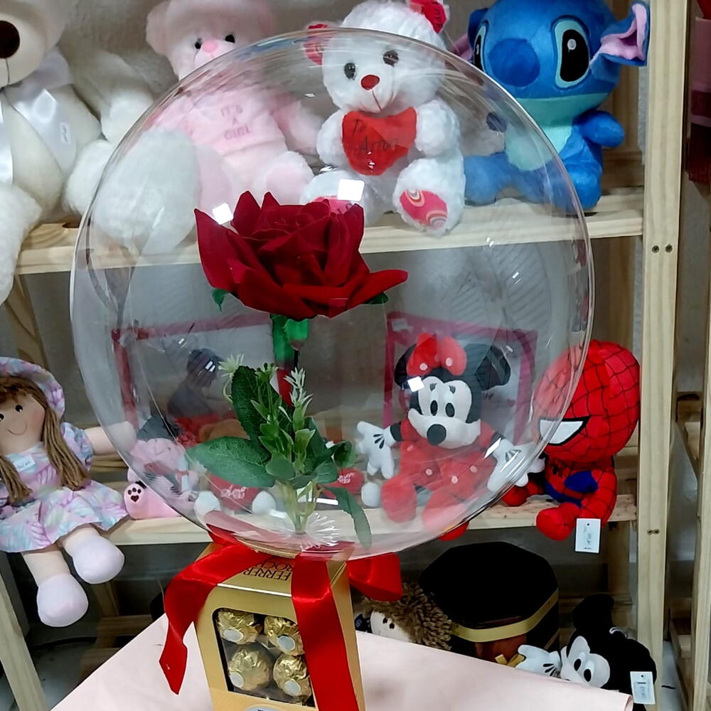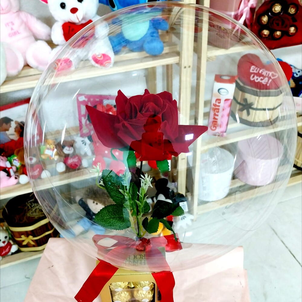 laço - 1 un. rosa artificial - 1 un. balão bubble - 1 un. ferrero rocher de 8 - 1 un.