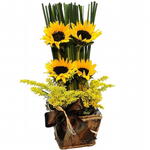 Traga um toque de sol para o seu espaço com este adorável arranjo de girassóis. Composto por 4 hastes de girassóis, vibrantes e cheias de vida, outros elementos de folhagem e complementos que adicionam um charme extra. Tudo organizado de maneira magistral em um vaso decorativo de alta qualidade que contribui para a apresentação estética geral. Este arranjo floral fará um belo ponto focal em qualquer sala, trazendo um elemento da natureza para o seu interior.