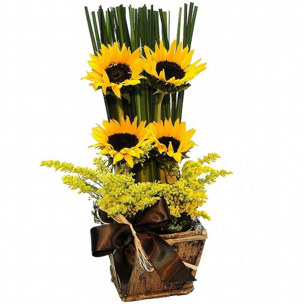 Traga um toque de sol para o seu espaço com este adorável arranjo de girassóis. Composto por 4 hastes de girassóis, vibrantes e cheias de vida, outros elementos de folhagem e complementos que adicionam um charme extra. Tudo organizado de maneira magistral em um vaso decorativo de alta qualidade que contribui para a apresentação estética geral. Este arranjo floral fará um belo ponto focal em qualquer sala, trazendo um elemento da natureza para o seu interior.