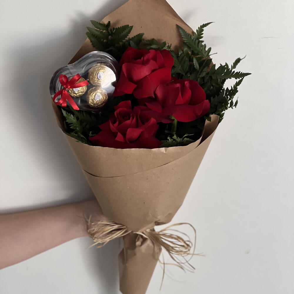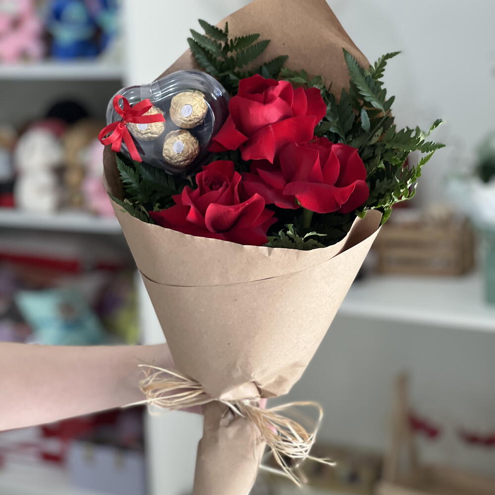 Este é um presente encantador que vai derreter o coração de qualquer um. A base é uma embalagem kraft, que evoca um toque rústico e aconchegante. Nela, você encontrará três rosas cuidadosamente selecionadas, suavemente acomodadas e envoltas em elegantes complementos verdes. Além disso, incluímos uma charmosa embalagem em forma de coração com laço, demonstrando a delicadeza no presente, e para um toque adicional de indulgência, também adicionamos três deliciosos bonbons Ferrero Rocher. Este presente é a combinação perfeita de estética visual, sensação tátil e prazer gustativo. Ideal para expressar seus sentimentos no Dia dos Namorados, aniversários ou em qualquer ocasião especial.