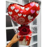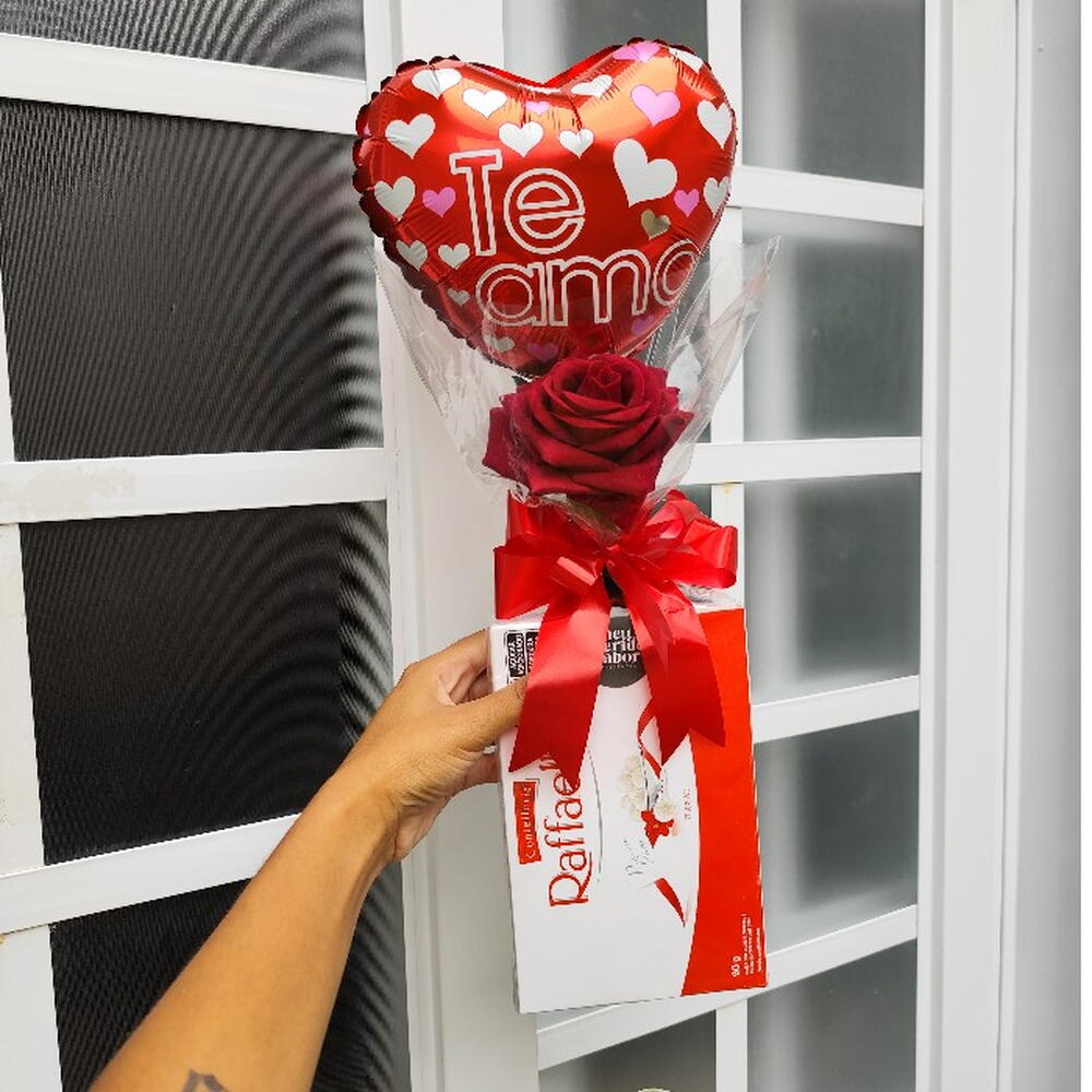 celofane transparente - 1 un. balão te amo - 1 un. laço personalizado - 1 un. bilhete impresso + envelope - 1 un. caixa com rafaello (90g) - 9 un. rosa artificial perfumada - 1 un.