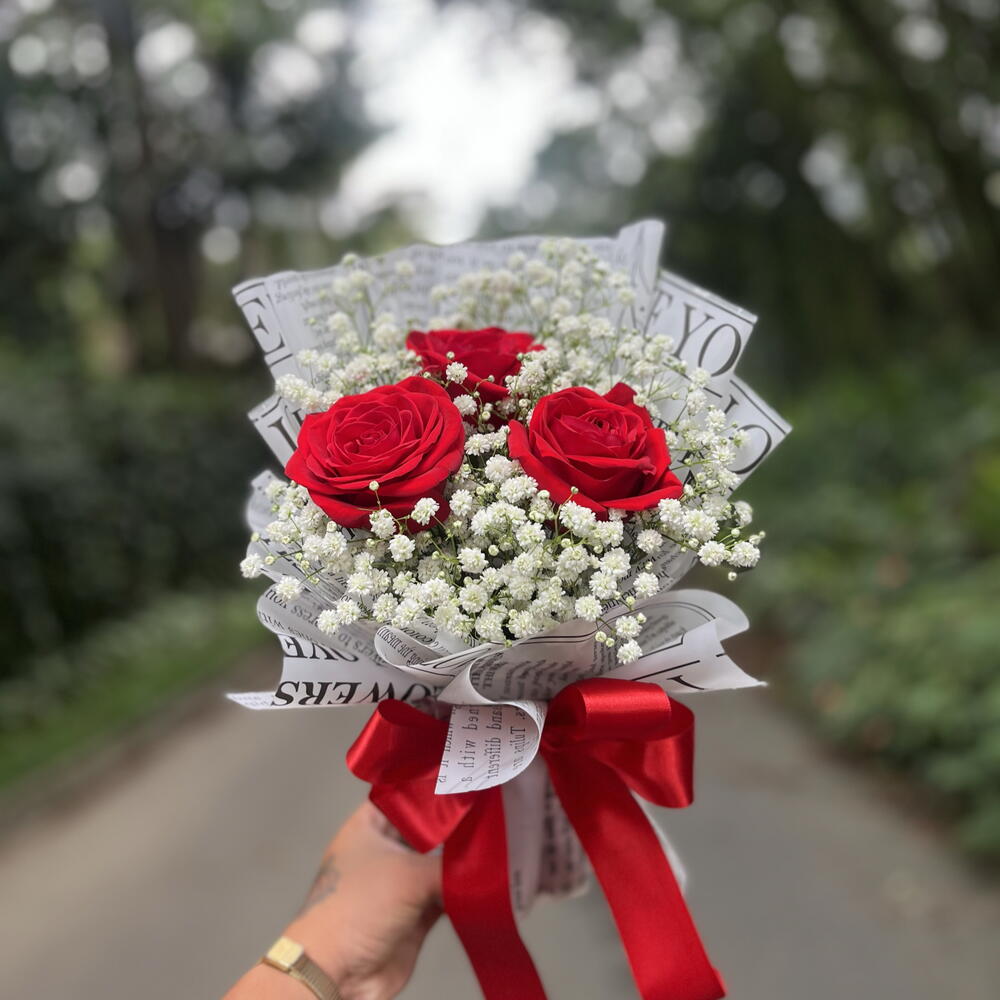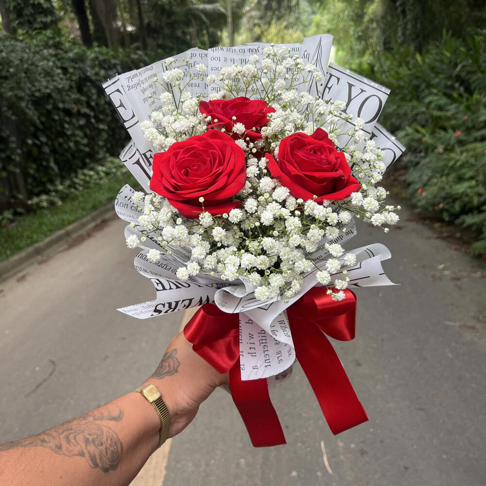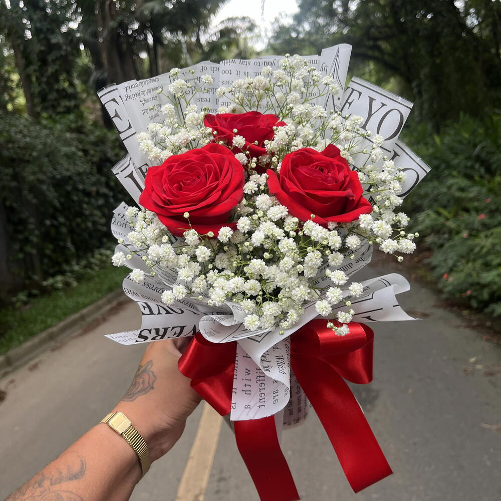 Encante-se com este elegante buquê, composto por 3 rosas naturais meticulosamente escolhidas e delicadas flores de mosquitinho. Este arranjo é a perfeita representação do bom gosto e sofisticação, sendo um presente encantador e cheio de significado para momentos especiais.