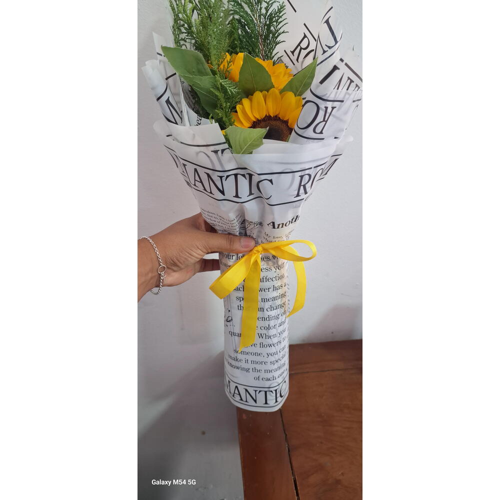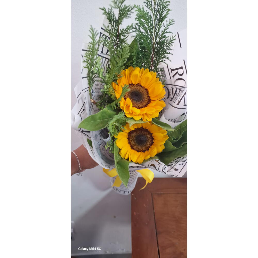 Este encantador buquê contém dois majestosos girassóis, cuidadosamente arranjados e embalados com celofane e fita. A embalagem elegante adiciona um toque de classe, enquanto a vividez dos girassóis transmite alegria e positividade. Perfeito para qualquer ocasião especial ou apenas para iluminar o dia de alguém.