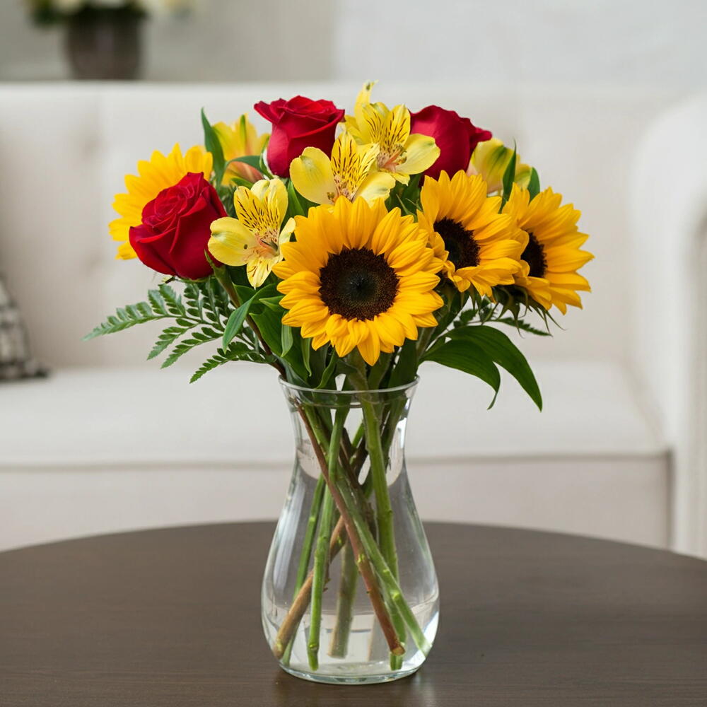 Este maravilhoso conjunto de flores em vaso é composto por elegantes rosas, ensolarados girassóis e delicadas astromélias. Temos três deslumbrantes rosas, cada uma esculpida até à perfeição. Quatro girassóis acrescentam uma explosão de brilho amarelo-ouro, símbolo de felicidade e positividade. Três astromélias trazem charme discreto e elegância suave. É a combinação perfeita que promete dar vida e cor a qualquer espaço.