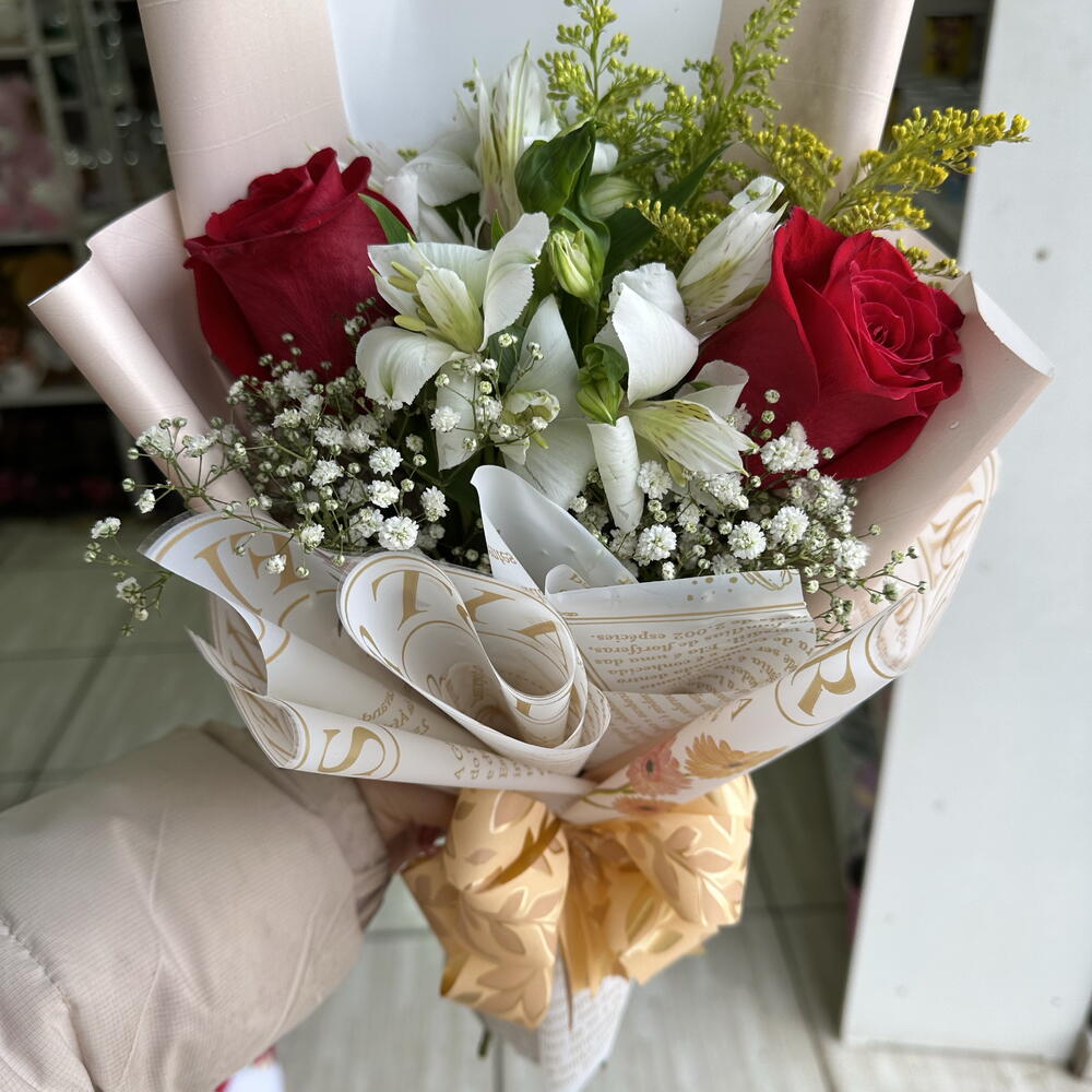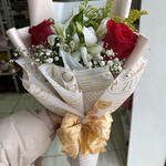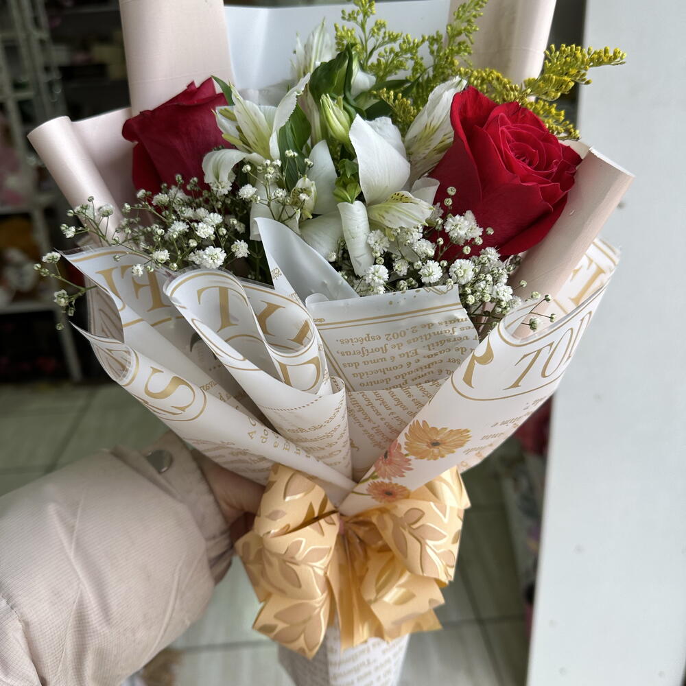 rosa vermelhas - 2 un. gipsofila branco - 3 un. folhagens verdes que realçam a delicadeza das rosa e acrescentam frescor ao arranjo - 4 un. embalagem dobradura - 1 un. laço para decorar - 1 un.