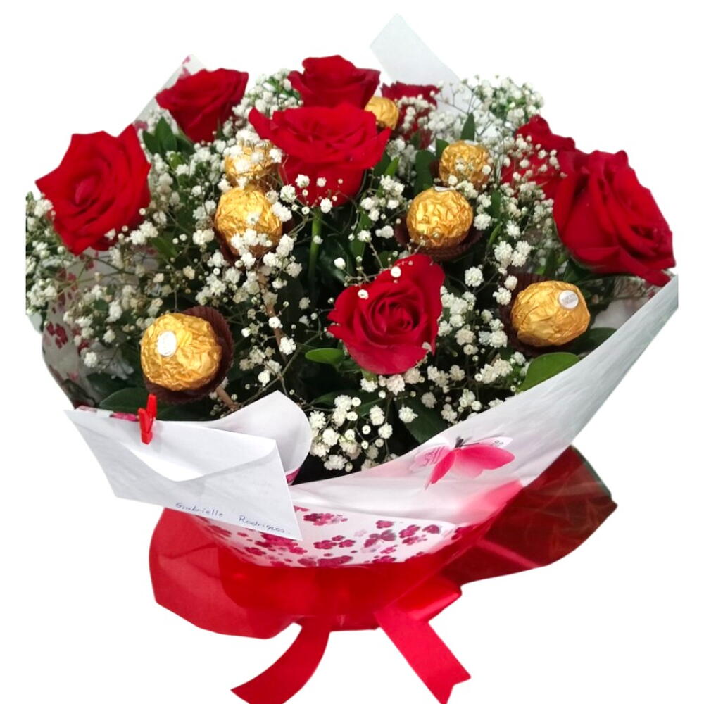 embalagem - 1 un. folhagens - 1 un. laço - 1 un. bombons ferreiro rocher - 8 un. ramalhete com rosa vermelhas - 8 un.