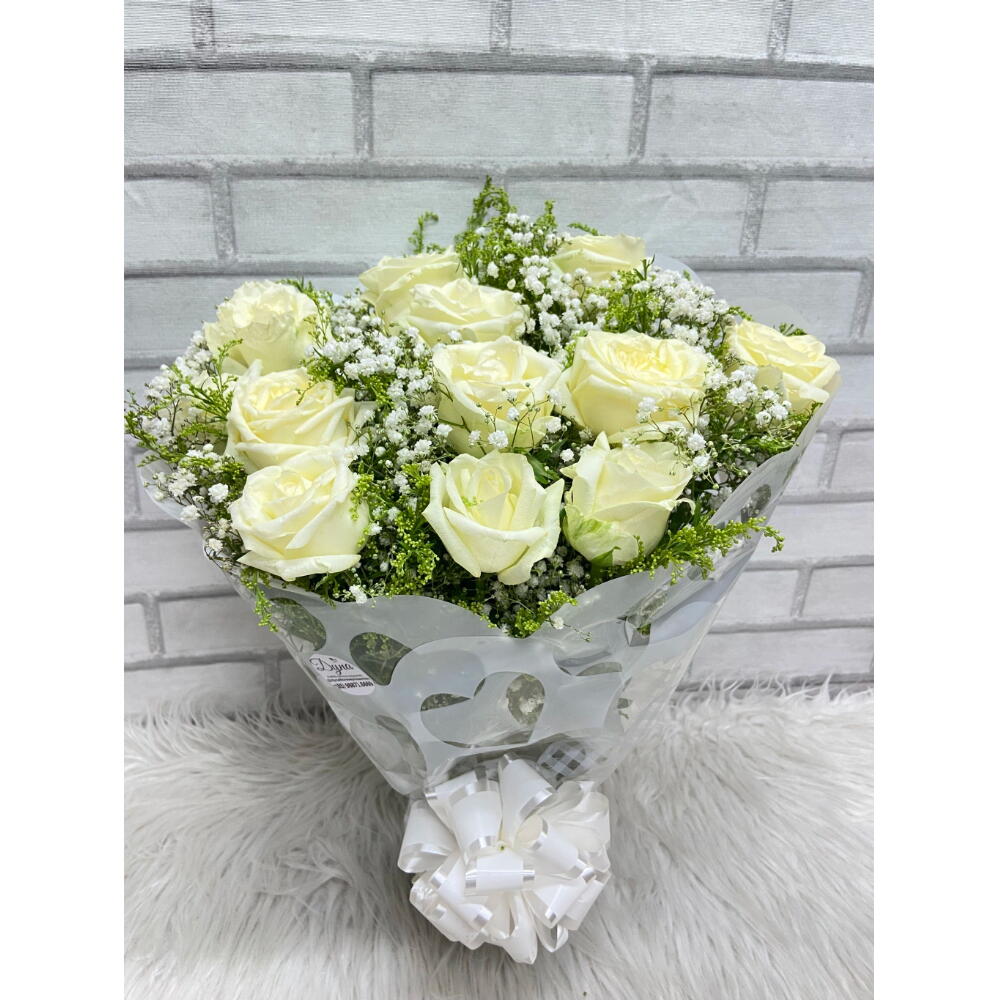 Este buquê luxuosamente arranjado, composto por 12 rosas brancas deslumbrantes, é perfeitamente complementado por folhagens selecionadas. O arranjo floral é delicadamente embalado para garantir seu frescor e beleza, e despretensiosamente adornado com um delicado laço. Uma escolha magnífica para marcar qualquer ocasião especial ou para admirar em sua própria casa.