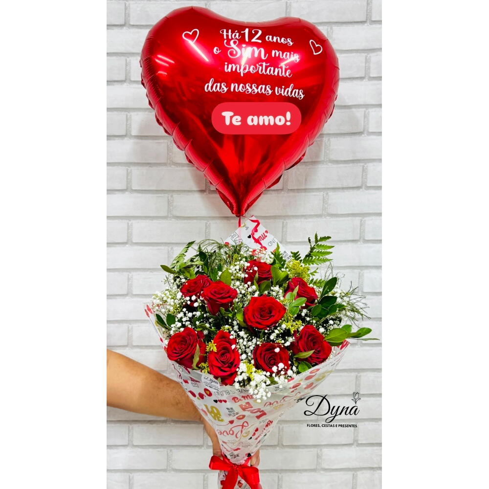 Esse elegante Kit de Presente é composto por nove rosas vermelhas, perfeitamente dispostas entre folhagens e complementos. Tudo isso bem embalado e adornado por um belo laço. O kit ainda inclui um balão personalizado, inflado com gás hélio, logo, eleva a sensação de alegria ao receber este presente. Este conjunto requintado é perfeito para ocasiões especiais ou para simplesmente expressar seus sentimentos a alguém querido.