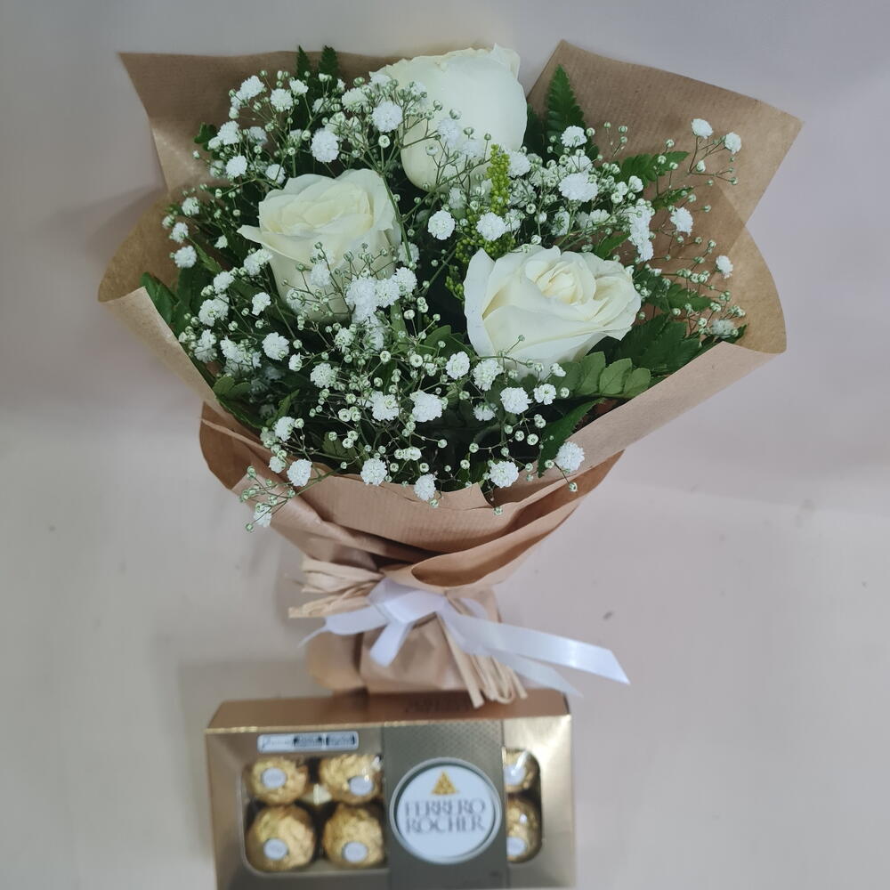 3 rosa brancas - 3 un. ferrero rocher 8 - 1 un.