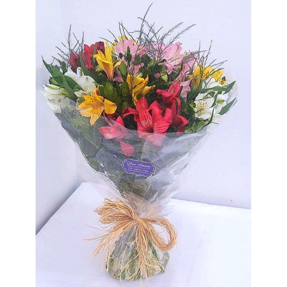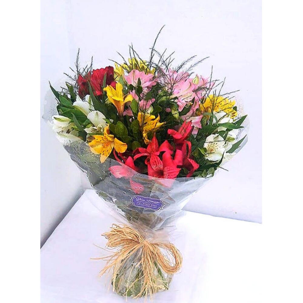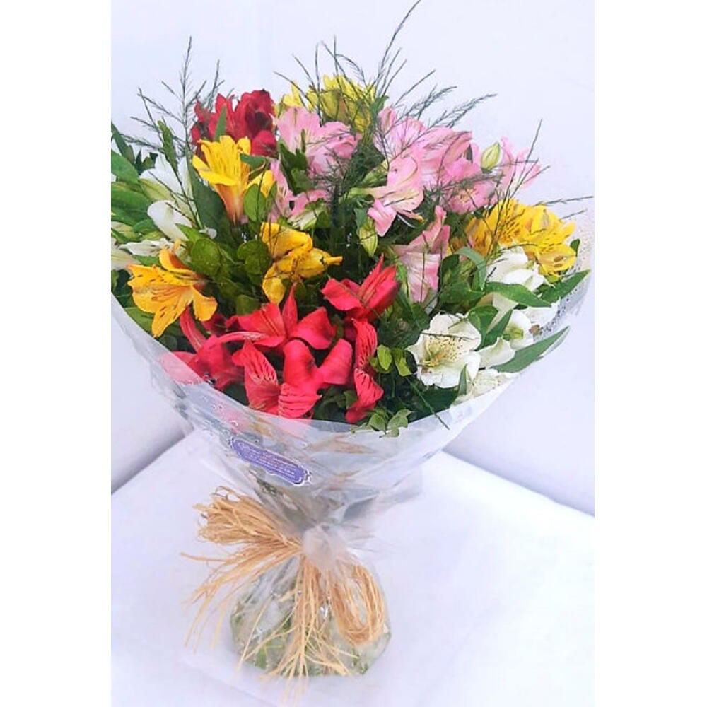 embalagem e laço - 1 un. arranjo de astromelias coloridas - 1 un. verdes e folhagens - 1 un.