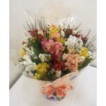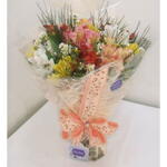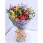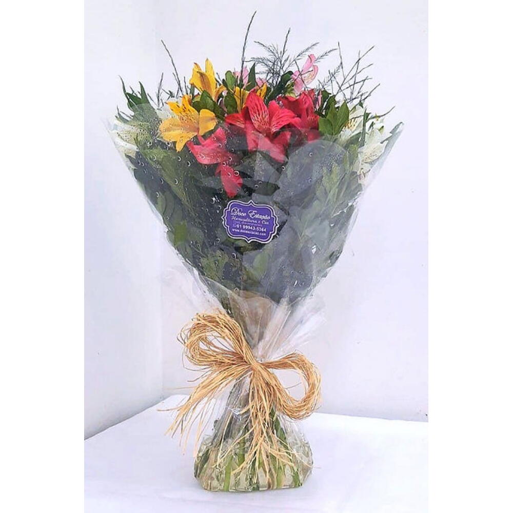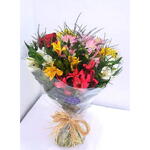 Abrace a beleza vibrante deste arranjo de flores pontuado por astromelias coloridas. Perfeitamente harmonizado com verdes frescos e folhagens, este arranjo é um espetáculo para os olhos. Completamente com uma embalagem elegante e um laço para uma apresentação perfeita, este produto é ideal para adicionar um toque decorativo ao seu espaço ou para presentear uma pessoa querida.