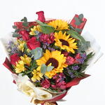 Este encantador buquê é composto por quatro belas rosas, simbolizando o amor e o respeito, e três vistosos girassóis, que espelham alegria e vitalidade. Essa combinação harmoniosa e atraente trará um toque de elegância e frescor para qualquer ambiente, sendo perfeita para presentear alguém especial ou simplesmente para enfeitar sua casa.