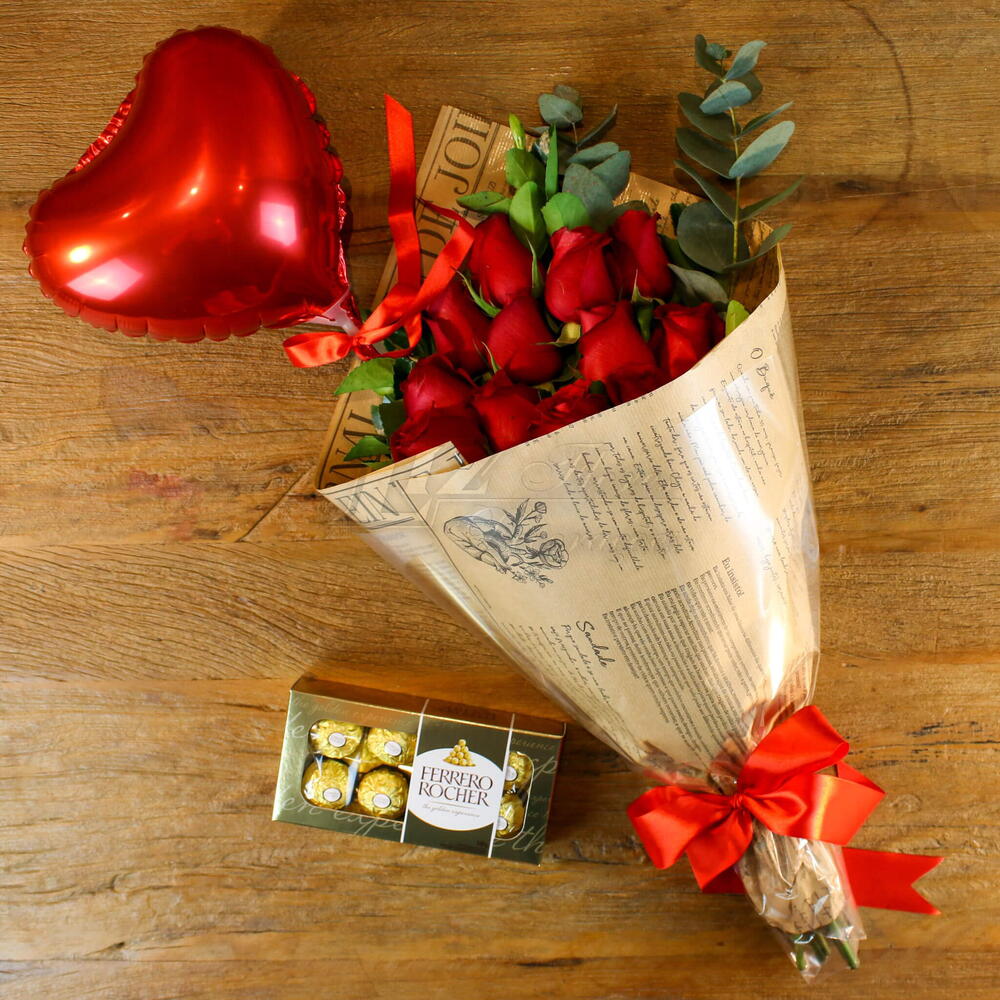 Este encantador presente vem com uma bela embalagem de presente, a surpresa perfeita para aqueles que amam delicadezas. Incluído neste conjunto está um buquê de rosas vermelhas, cuidadosamente selecionadas para expressar seu amor e apreço. As doze rosas lindas são complementadas com um mix de folhagens frescas. Uma caixa elegante de Ferrero Rocher com 8 unidades está incluída para os amantes de doces, tornando o presente ainda mais especial. E para finalizar, um balão em formato de coração adiciona um toque de romance. Este é um presente que deixa uma impressão duradoura, perfeito para ocasiões especiais ou apenas para expressar seu amor.