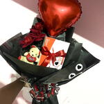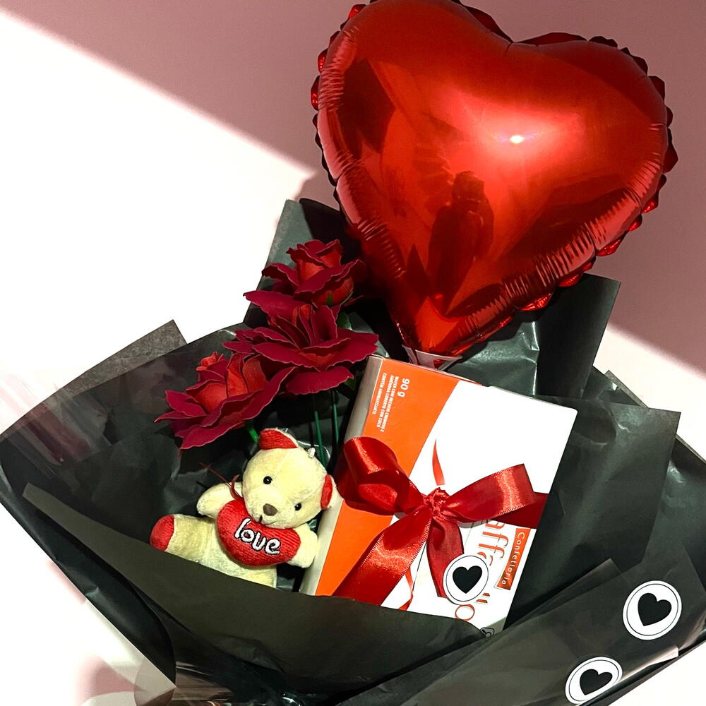 rosa vermelhas artificiais - 3 un. raffaello 90g - 1 un. laço bola de fita - 1 un. balão coração - 1 un. mini pelúcia chaveiro - 1 un. laço com fita cetim - 1 un.