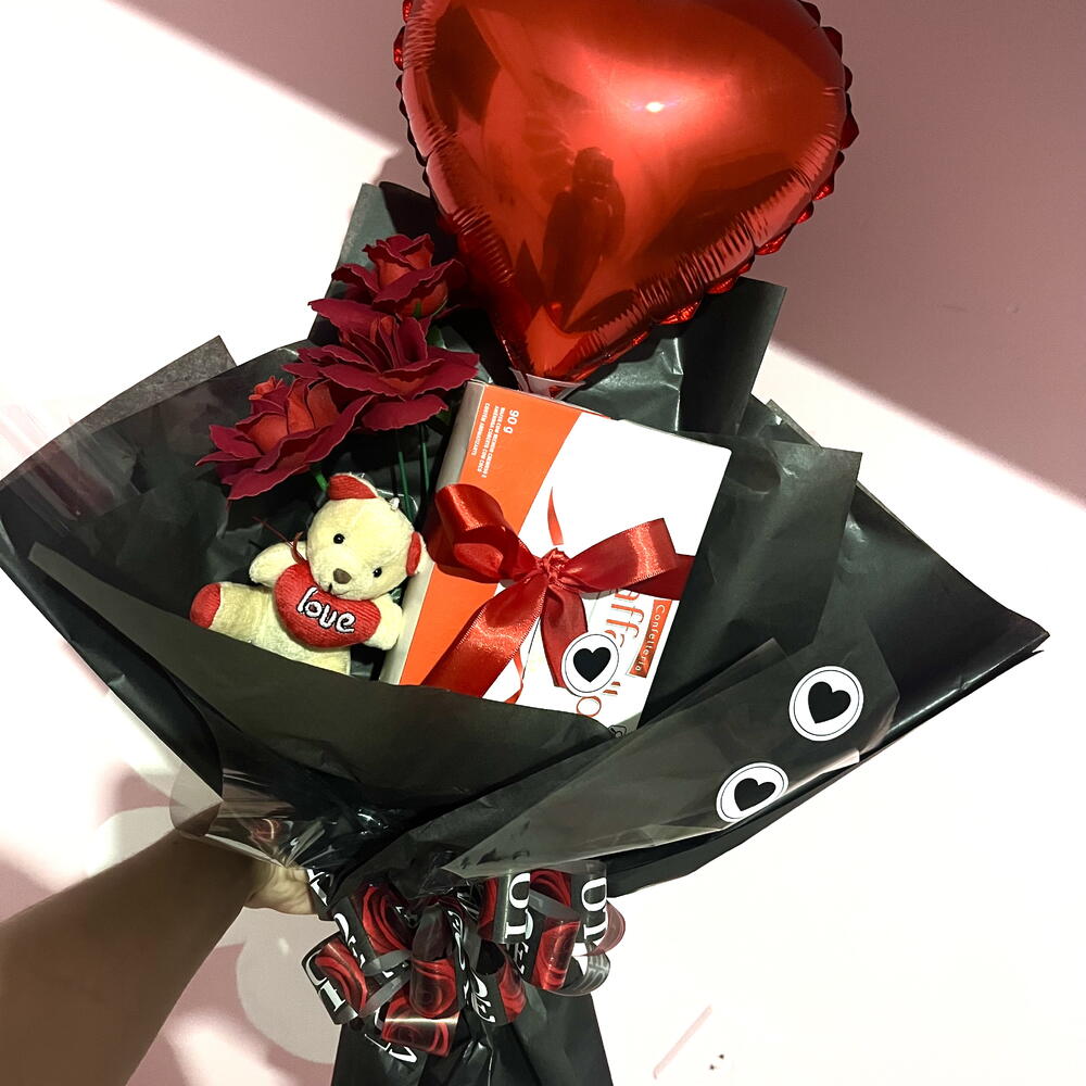 Um presente que combina romance e fofura! Ramalhete de rosas artificiais, Raffaello e pelúcia para você compartilhar com quem ama