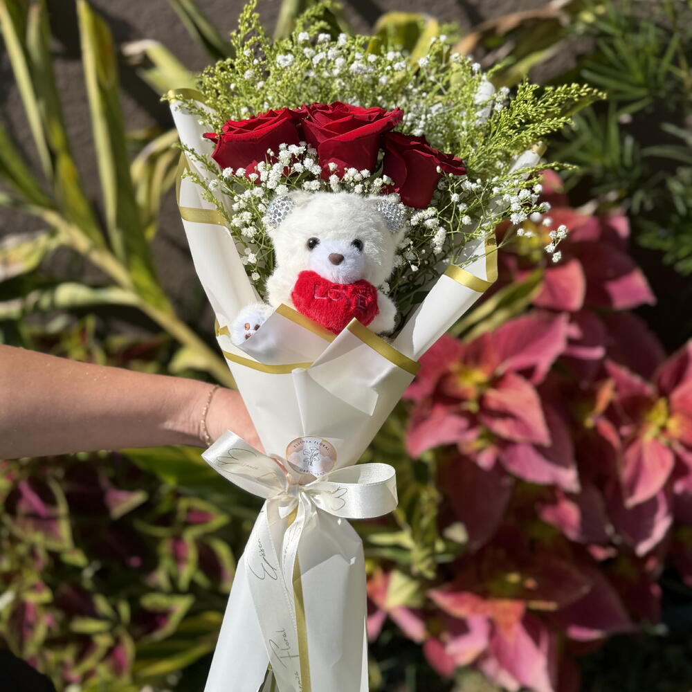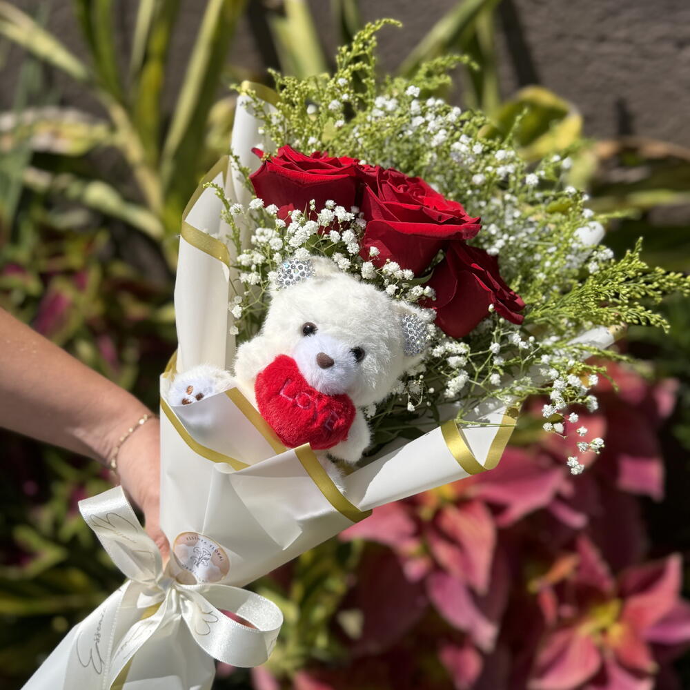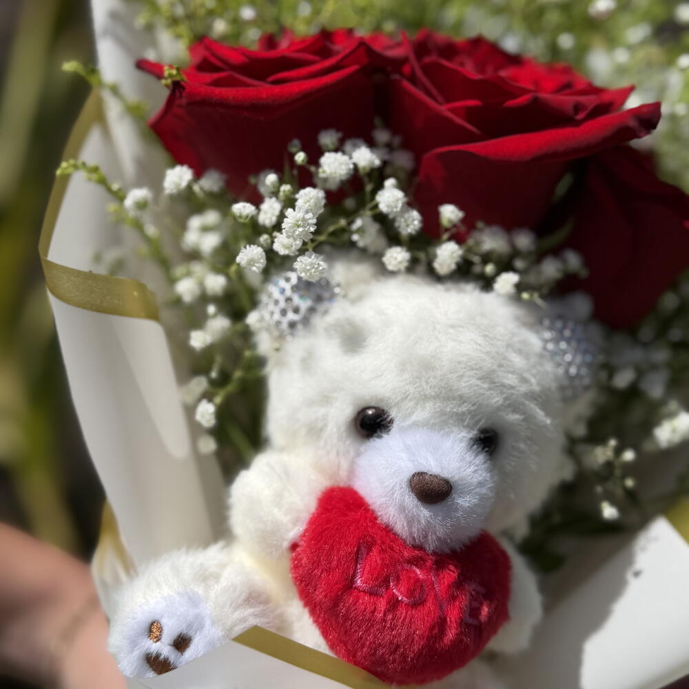 Este encantador buquê traz uma combinação elegante de três sofisticadas rosas cor de rosa, complementadas com uma unidade de folhagens de delicado frescor. Para realçar ainda mais a beleza, o buquê é cuidadosamente emabalado e finalizado com um laço elegante. Além disso, acompanha um charmoso urso de pelúcia, tornando este buquê a opção perfeita para expressar sentimentos de amor e carinho em ocasiões especiais. Coloração das rosas podem alterar de acordo com a disponibilidade.