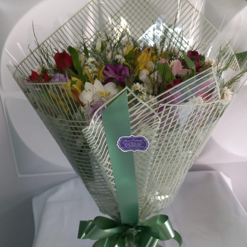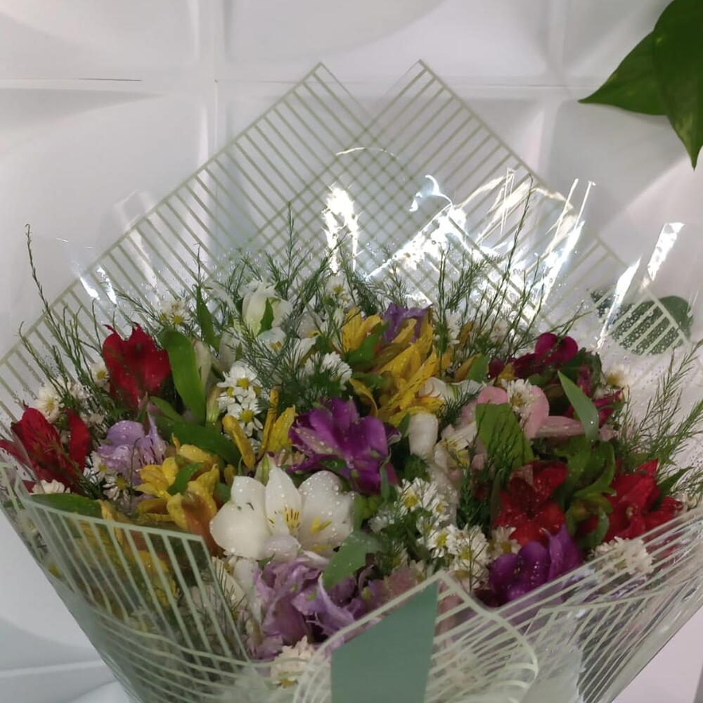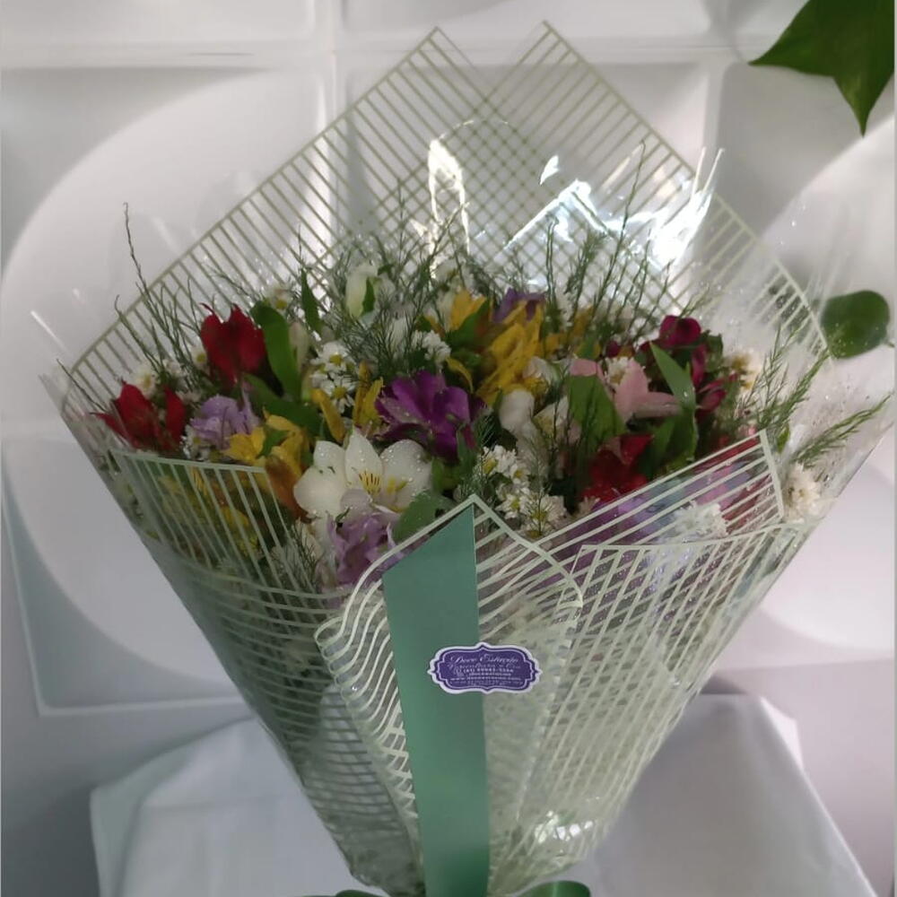 folhagens - 1 un. laço - 1 un. astroméria - 20 un. embalagem moderna - 1 un.