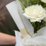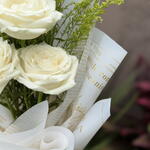 Este buquê é uma maravilhosa composição de elegância e charme. Reúne 3 unidades de rosas brancas, símbolo de pureza e inocência, destacadas pela singular folhagem que lhe dá uma sensação vibrante e fresca. O buquê é graciosamente amarrado com um laço sofisticado para aumentar ainda mais a sua beleza. Para proteger e acentuar a sua apresentação, possui 2 unidades de embalagens presentáveis premium, perfeitas para fazer desse buquê um presente realmente memorável. Ideal para ocasiões especiais ou simplesmente para alegrar o dia de alguém querido.