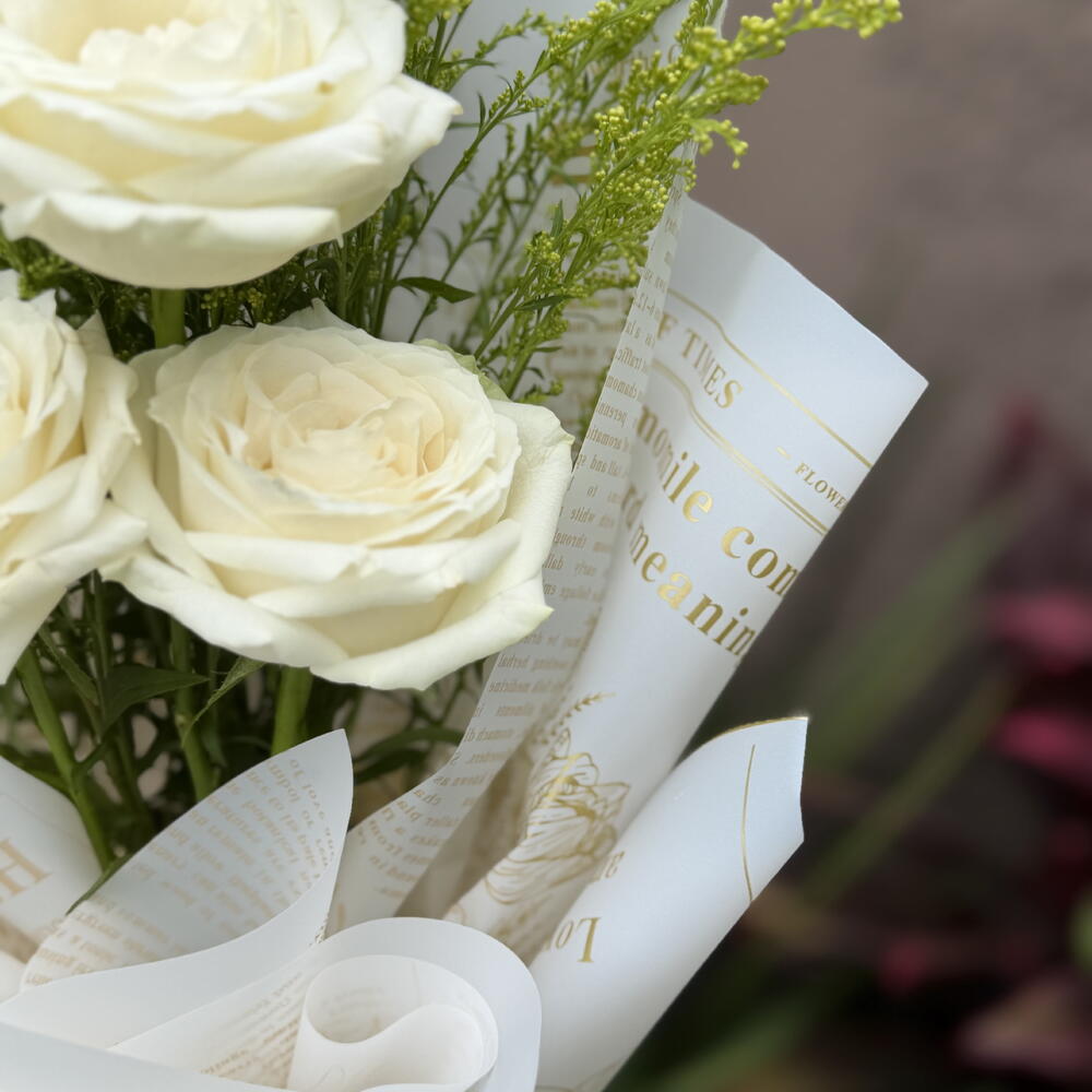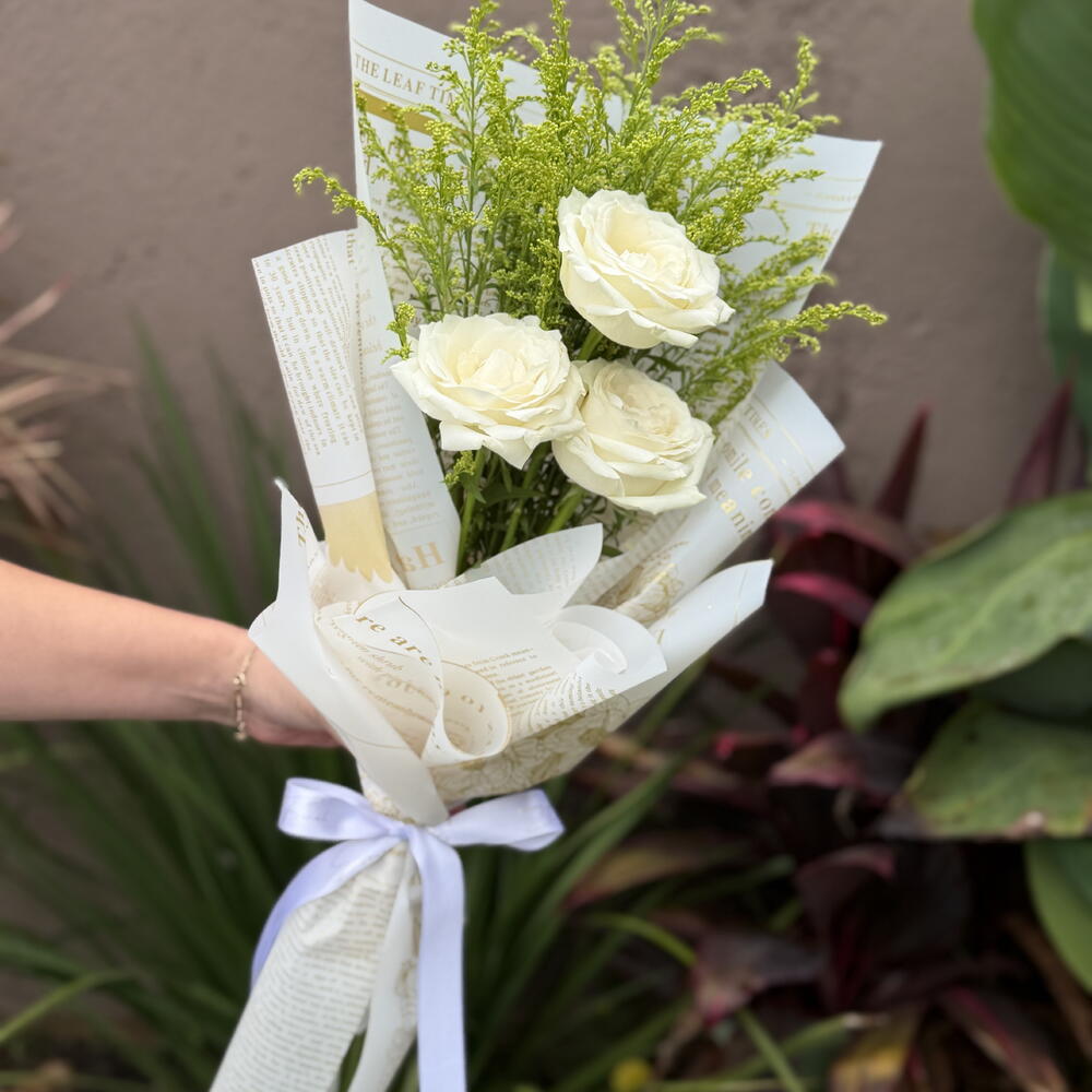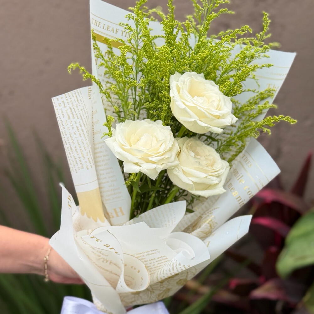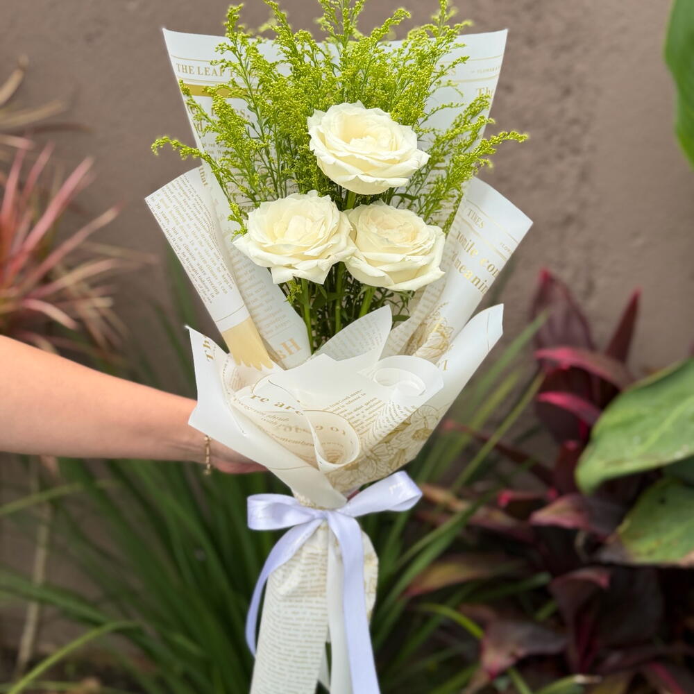 Este buquê é uma maravilhosa composição de elegância e charme. Reúne 3 unidades de rosas brancas, símbolo de pureza e inocência, destacadas pela singular folhagem que lhe dá uma sensação vibrante e fresca. O buquê é graciosamente amarrado com um laço sofisticado para aumentar ainda mais a sua beleza. Para proteger e acentuar a sua apresentação, possui 2 unidades de embalagens presentáveis premium, perfeitas para fazer desse buquê um presente realmente memorável. Ideal para ocasiões especiais ou simplesmente para alegrar o dia de alguém querido.