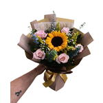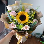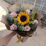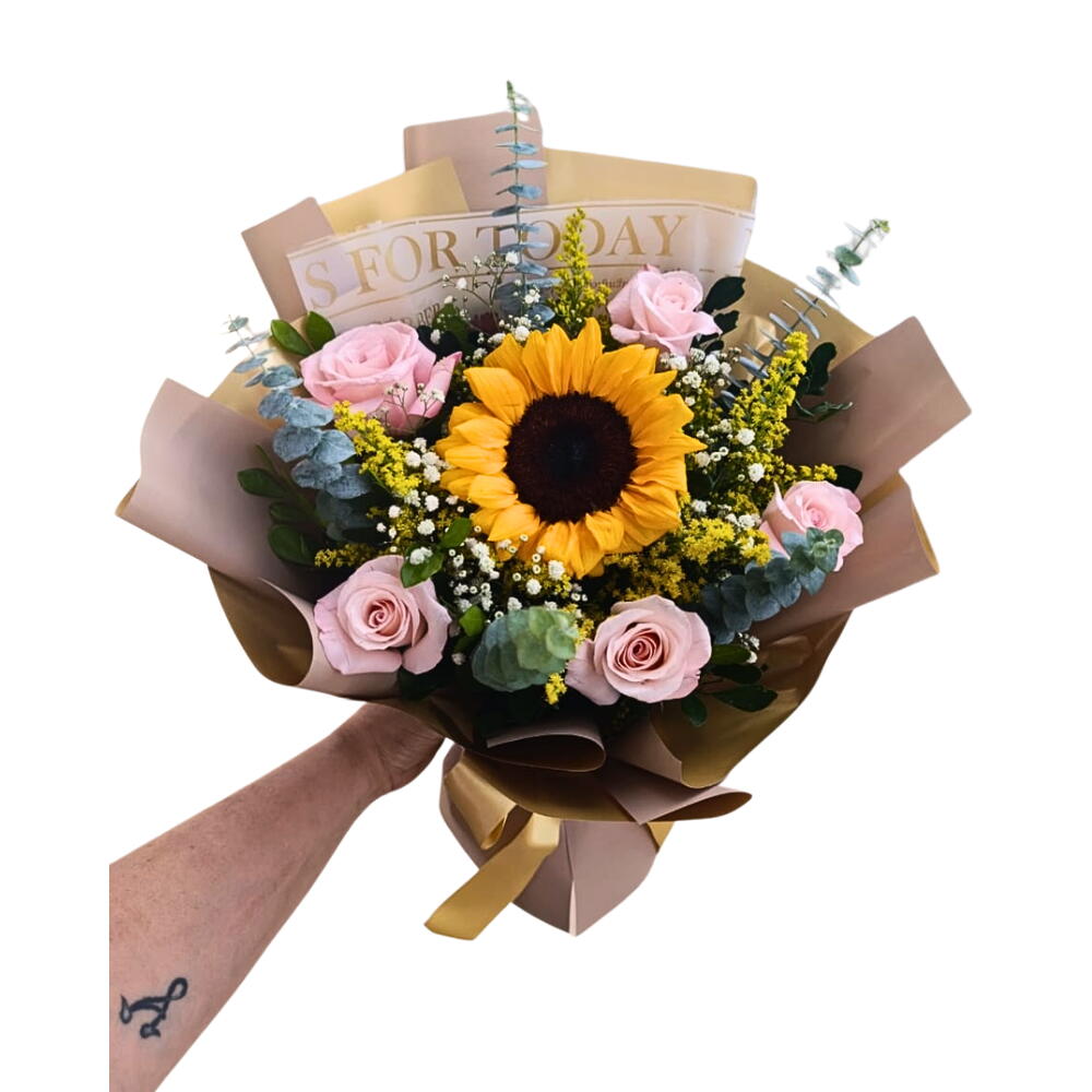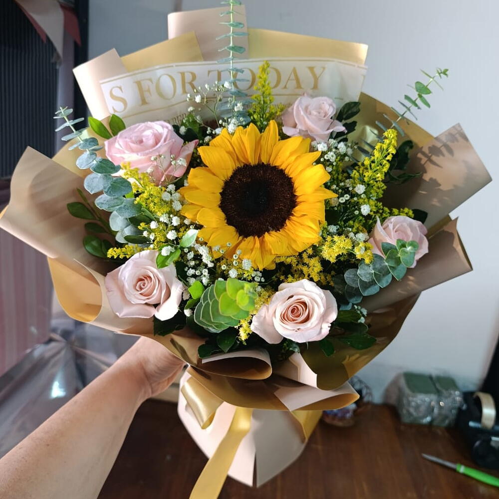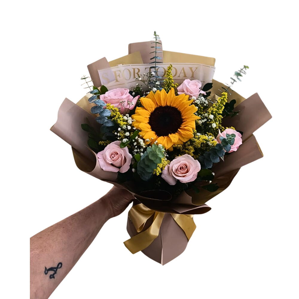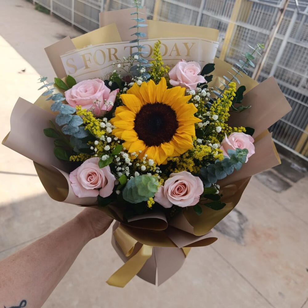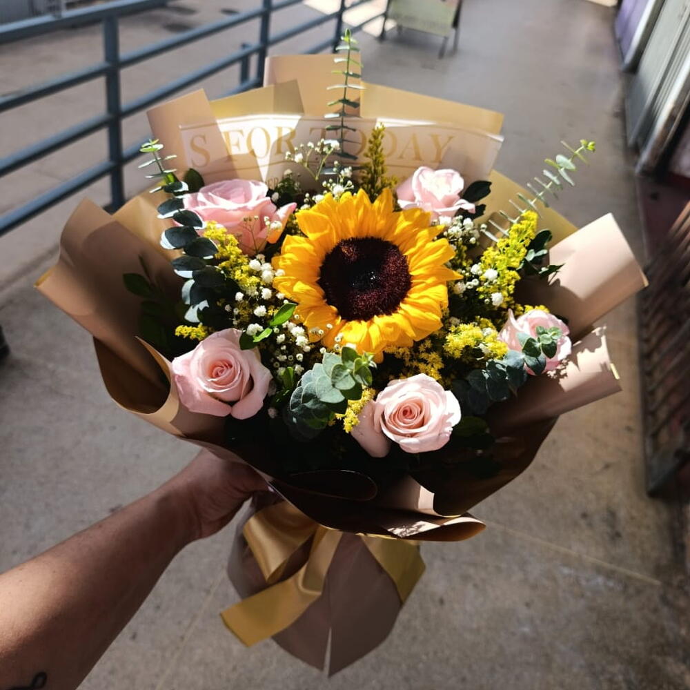 tango - 4 un. girassol - 1 un. gipsofila - 2 un. eucalipto - 4 un. rosa cor de rosa - 5 un. embalagem especial coreana e laço de fita de cetim - 1 un.