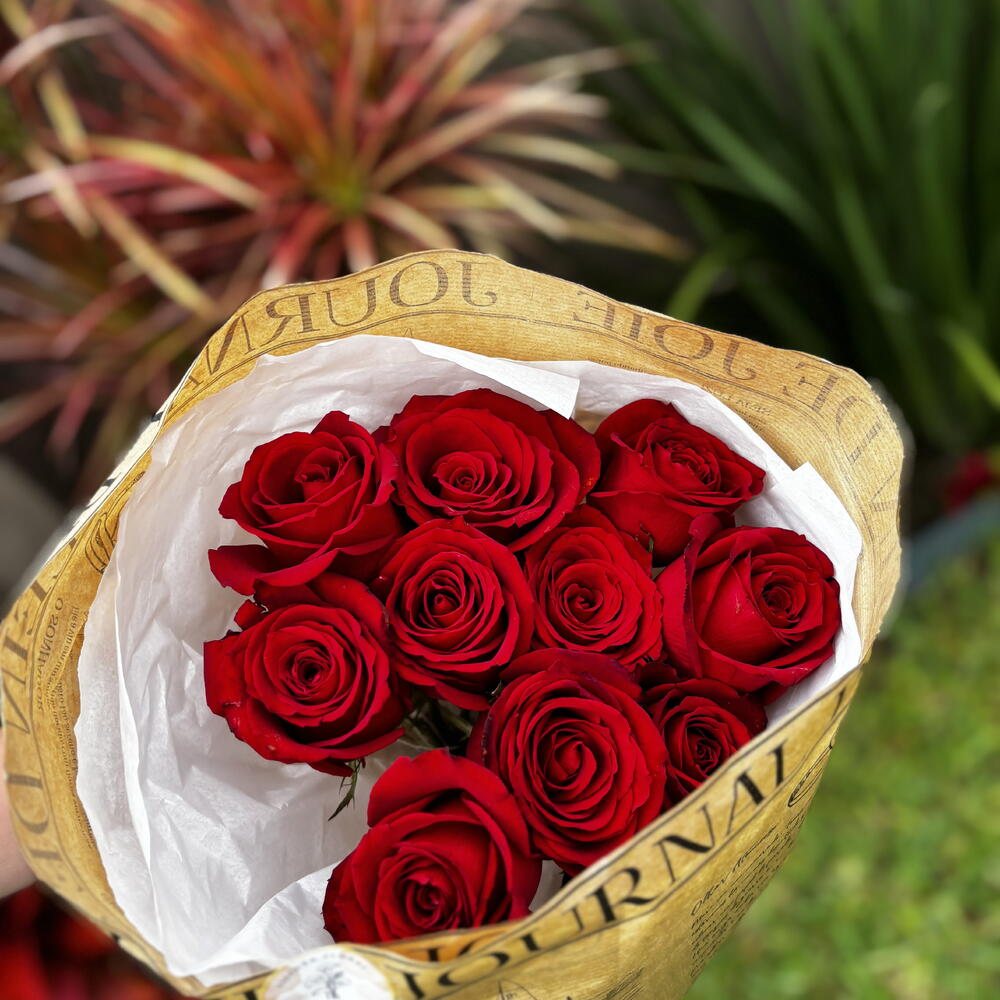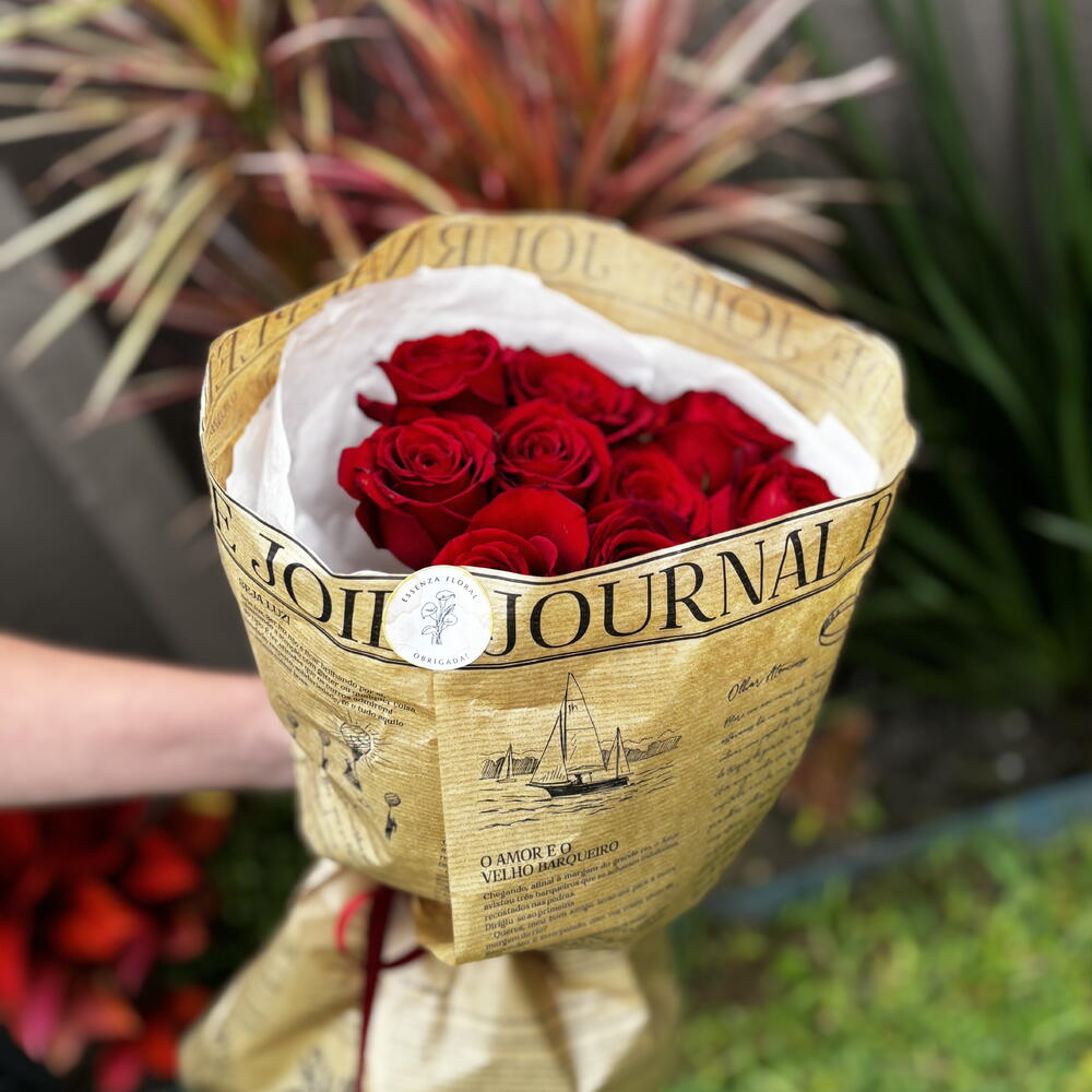 Este buquê encantador composto por 10 rosas vermelhas luxuriantes é a manifestação perfeita do amor e da paixão. Cada rosa é cuidadosamente arranjada e envolvida numa folha de papel coreano especial, acentuando a sua beleza natural e riqueza de cores. Além disso, um laço personalizado adiciona um toque final elegante, tornando-o a escolha perfeita para ocasiões especiais ou simplesmente para alegrar o dia de alguém.