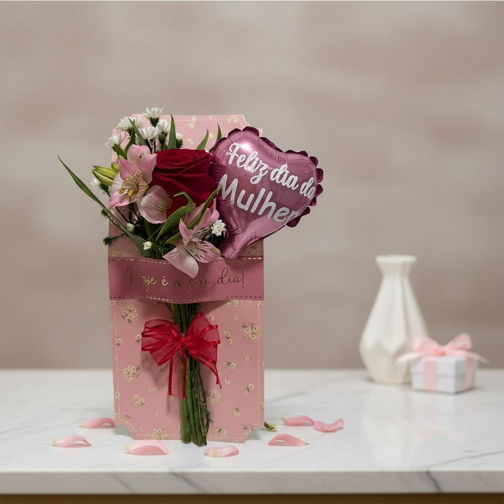 rosa - 1 un. astroméria - 1 un. balao metalizado - 1 un. cartão embalagem - 1 un.