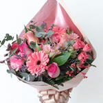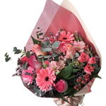 Esse buquê deslumbrante consiste em uma unidade de flores mistas na delicada tonalidade rosa, suavemente complementada por folhagens verdes frescas. Todas essas lindezas são elegantemente embaladas em uma unidade atraente, e adornadas com um laço encantador, fazendo deste buquê o presente perfeito para expressar seus sentimentos mais profundos.