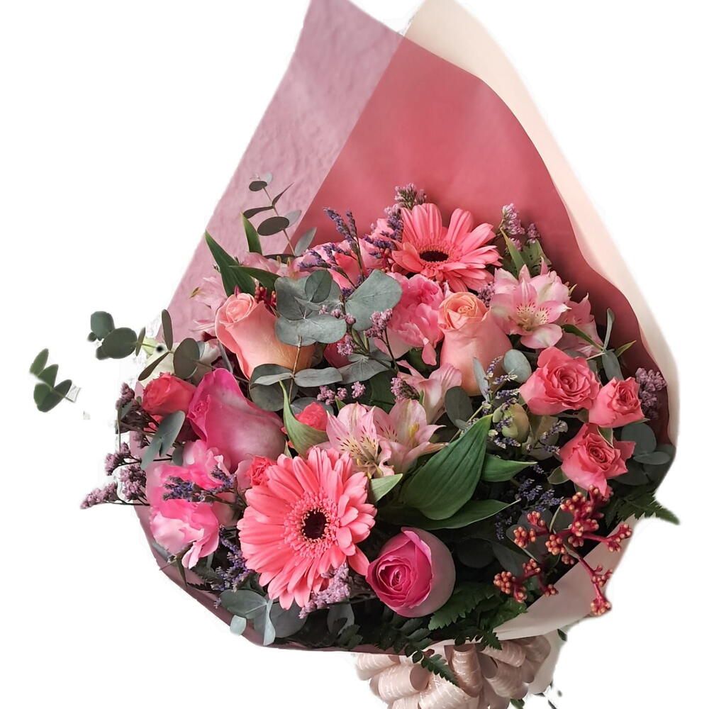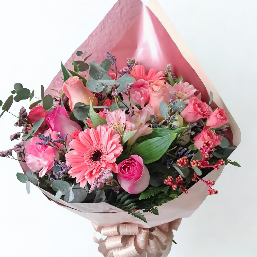 Esse buquê deslumbrante consiste em uma unidade de flores mistas na delicada tonalidade rosa, suavemente complementada por folhagens verdes frescas. Todas essas lindezas são elegantemente embaladas em uma unidade atraente, e adornadas com um laço encantador, fazendo deste buquê o presente perfeito para expressar seus sentimentos mais profundos.
