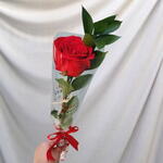 Uma rosa vermelha elegante com acabamento delicado, folhagens naturais, papel e laço. Perfeita para momentos especiais e declarações de amor.