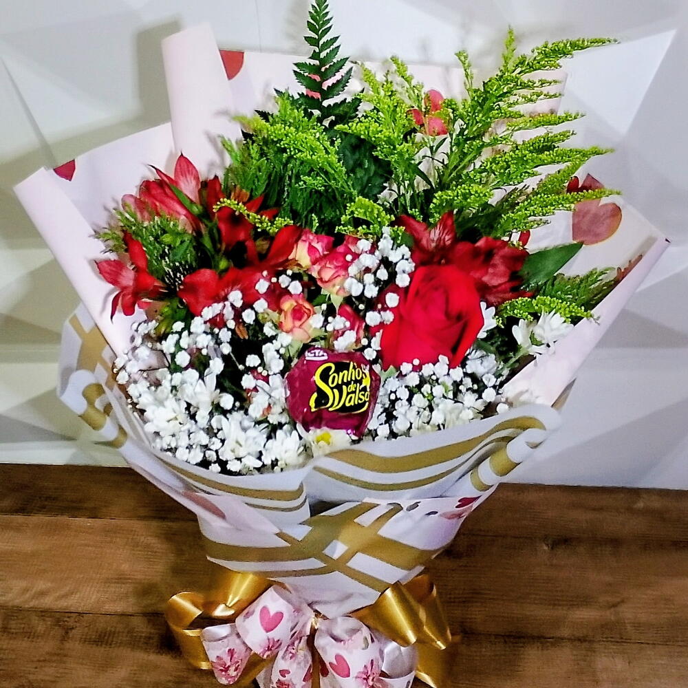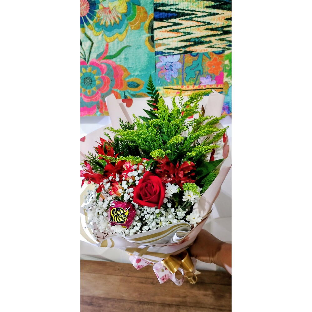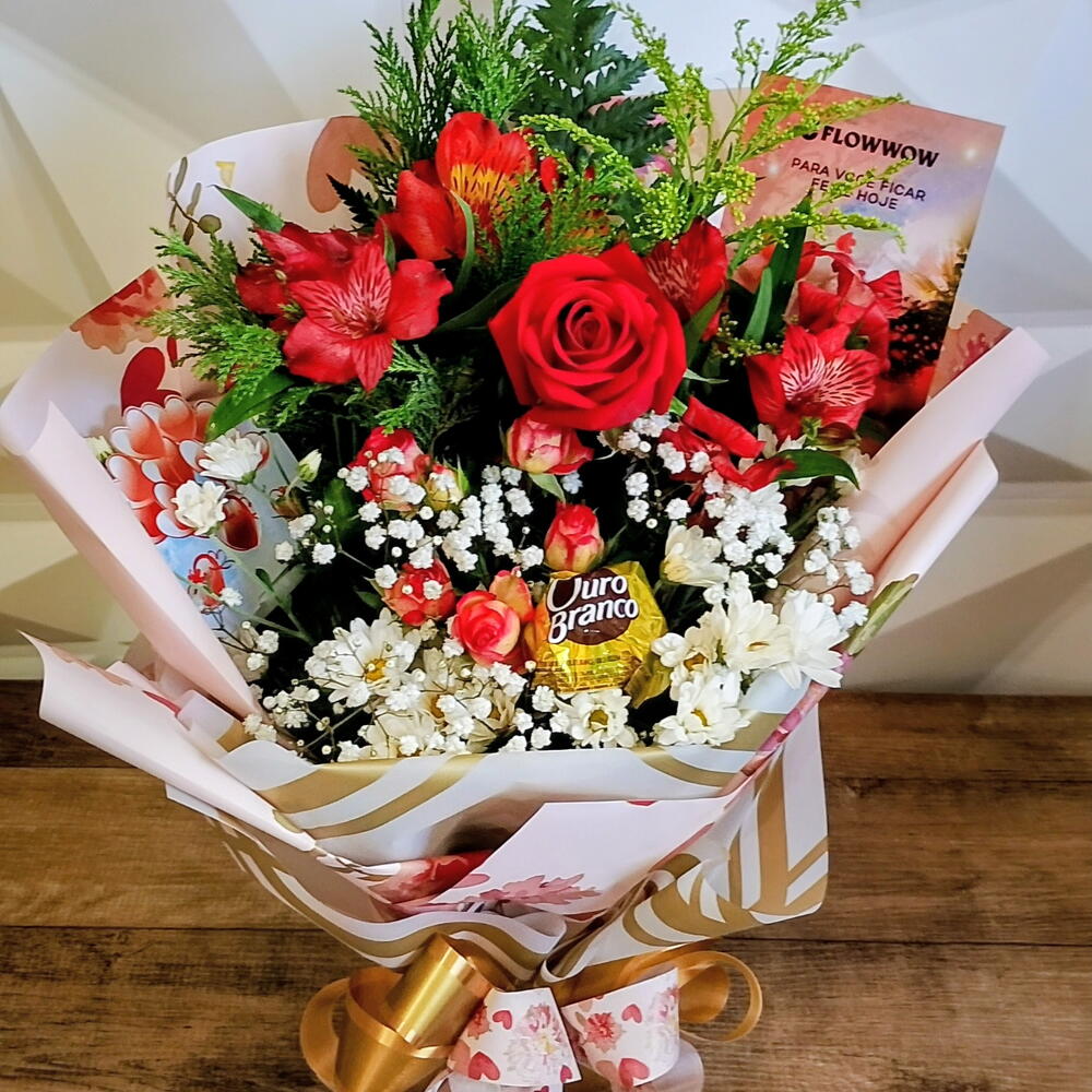 rosa vermelha - 1 un. gypsofila - 1 un. bombom - 1 un. tango e folhagem - 3 un. cartão de mensagem - 1 un. astroméria hastes - 2 un. embalagem premium estruturada com design sofisticado - 1 un. rosa spray galho - 1 un.