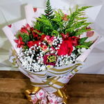 Imbuído da delicadeza da rosa vermelha e da exótica astroméria, este presente combina sofisticação e doçura numa só embalagem. Encante-se com a mistura de gypsofila, tango, folhagem e um delicado ramo de rosa spray, organizados artisticamente em uma embalagem premium excepcionalmente estruturada com design sofisticado. Adicione um toque de indulgência ao presente com um bombom incluído - um prazer doce e cremoso que completa a experiência. Este presente também vem com um cartão de mensagem, permitindo que você expresse seus sentimentos mais profundos. Faça uma declaração de amor, amizade ou gratidão com este deslumbrante presente com chocolate.